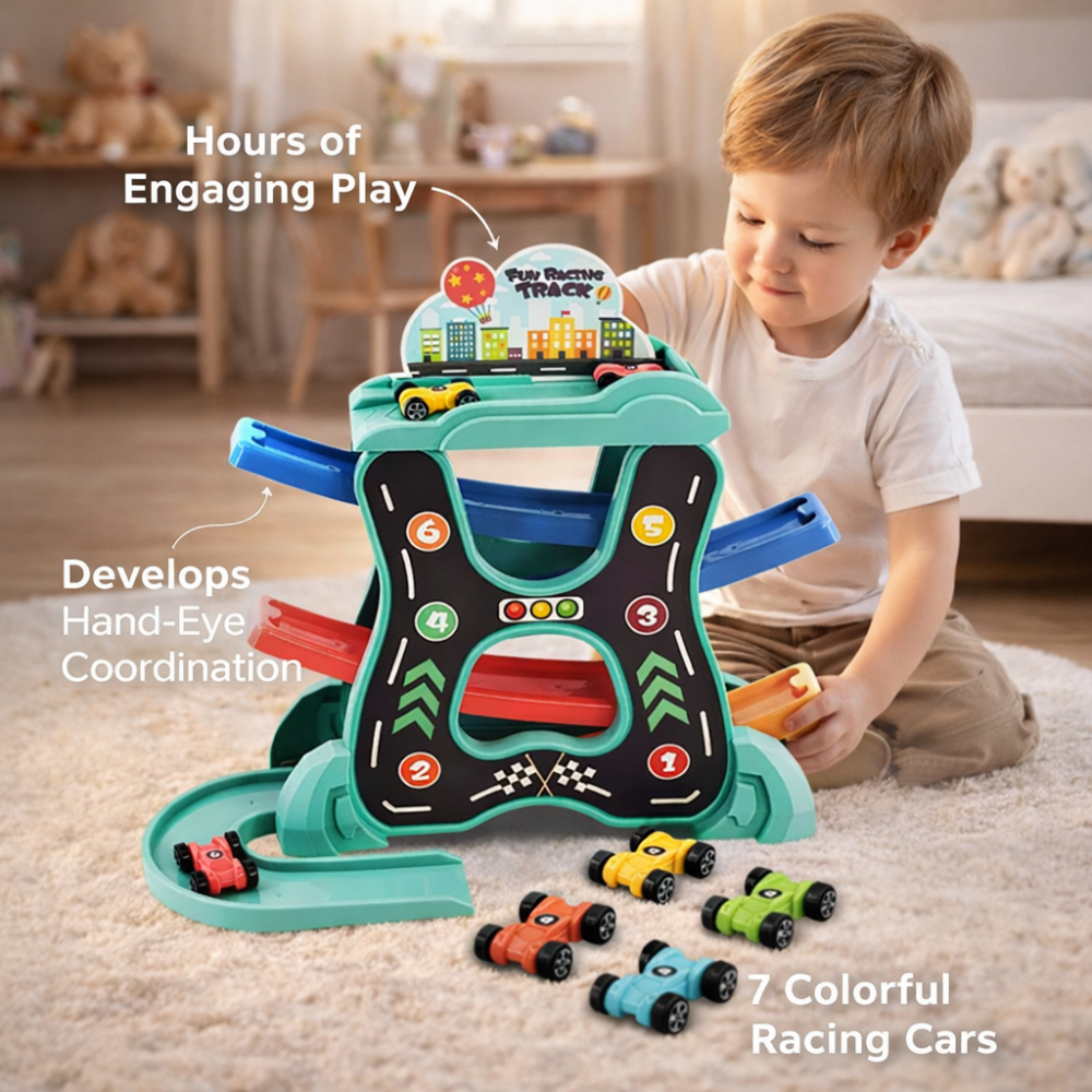 Aceasta pista de masini cu masinute este jucaria perfecta pentru cei mai mici pasionati de masini. Toboganele colorate si cele sapte masinute in culori diferite garanteaza ore intregi de joaca captivanta. Pista este conceputa pentru a dezvolta coordonarea mana-ochi a copiilor, pentru a stimula concentrarea si pentru a incuraja gandirea logica. Fiecare coborare a masinutelor ofera bucurie si emotie, iar culorile variate ale elementelor stimuleaza imaginatia si perceptia copilului. Datorita constructiei solide si designului atractiv, aceasta jucarie este ideala atat pentru joaca acasa, cat si pentru gradinite sau spatii de joaca.
