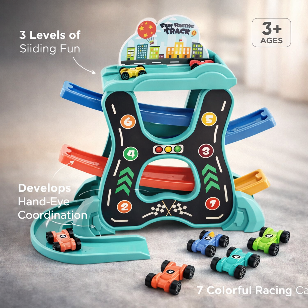 Pista educativa cu 3 niveluri si 7 masinute colorate care aluneca pe tobogan. Jucarie interactiva ce stimuleaza coordonarea mana-ochi, gandirea logica si imaginatia copiilor. Include pista multicolora, masinute de curse si stickere decorative. Recomandata copiilor peste 3 ani.