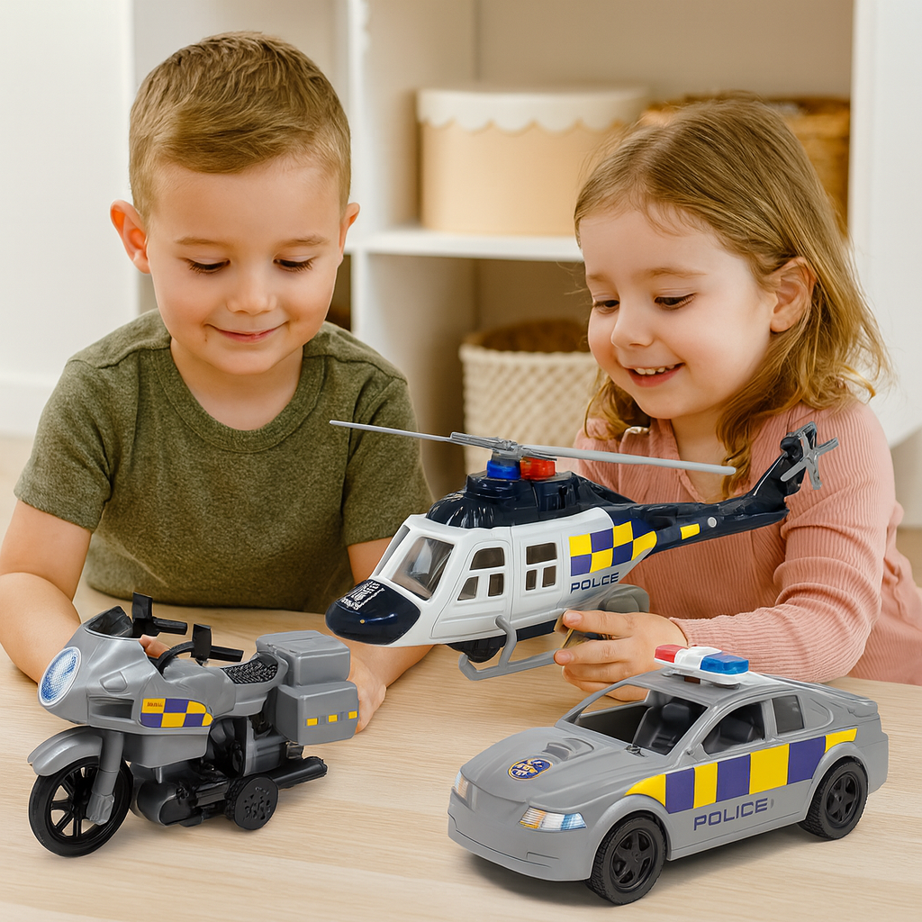 Set complet de politie pentru copii, cu elicopter, masina, motocicleta si accesorii. Vehicule realiste, efecte de lumina si sunet, material sigur si certificat CE. Perfect pentru jocuri de rol si scenarii de salvare.