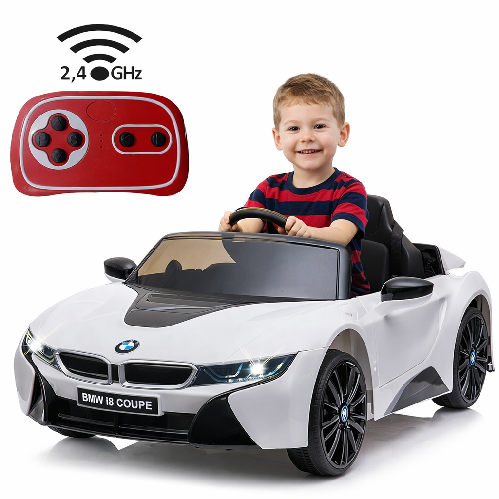 Masinuta electrica BMW i8 Coupe pentru copii, cu baterie 12V, lumini LED, scaun confortabil si telecomanda pentru parinti, potrivita pentru plimbari sigure si distractive.