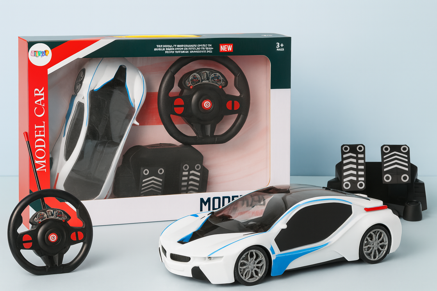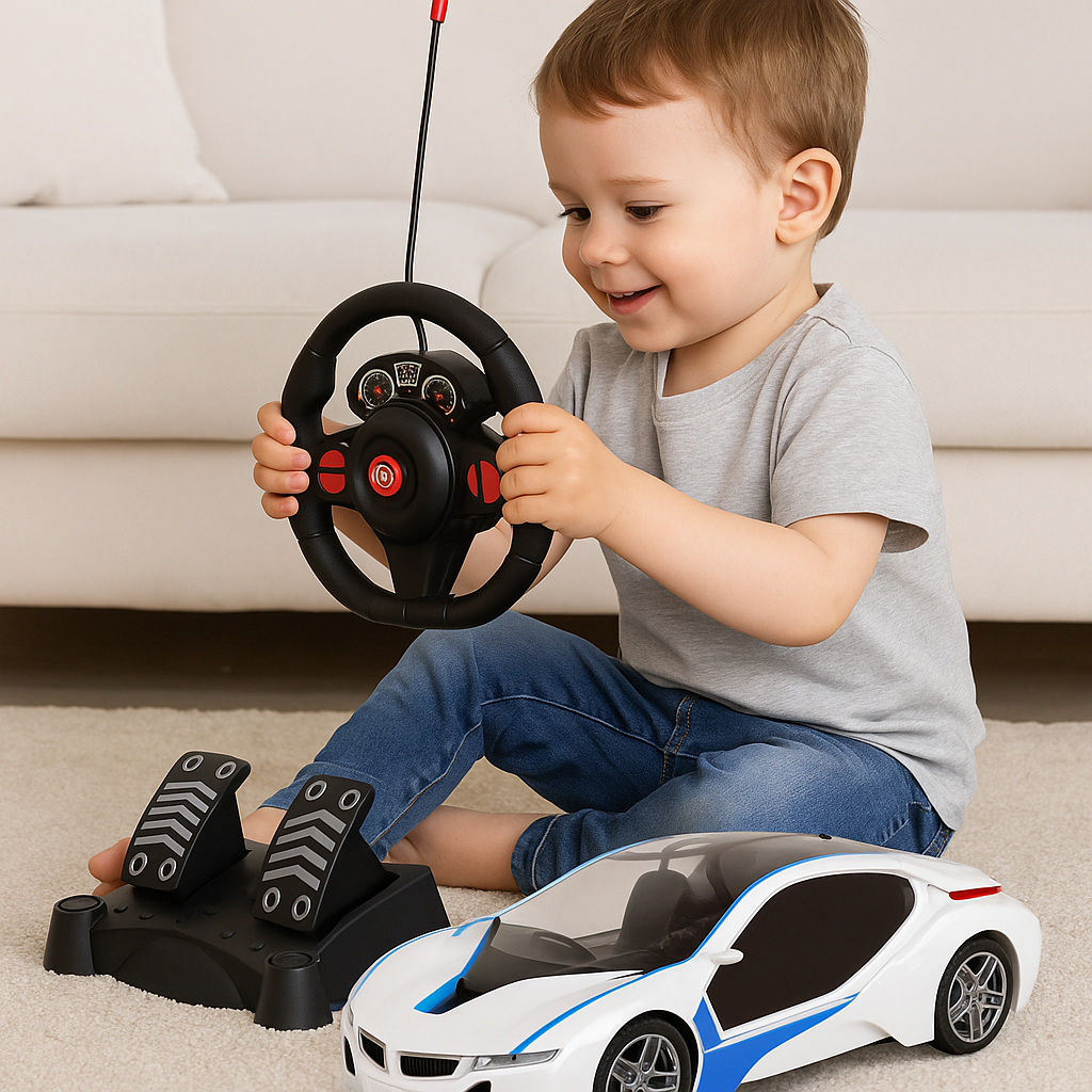 Mașină RC cu volan de control și pedale pentru accelerație/frână, lumini LED și sunete de motor – tracțiune spate pentru drifting spectaculos, recomandată copiilor 3+ ani.
