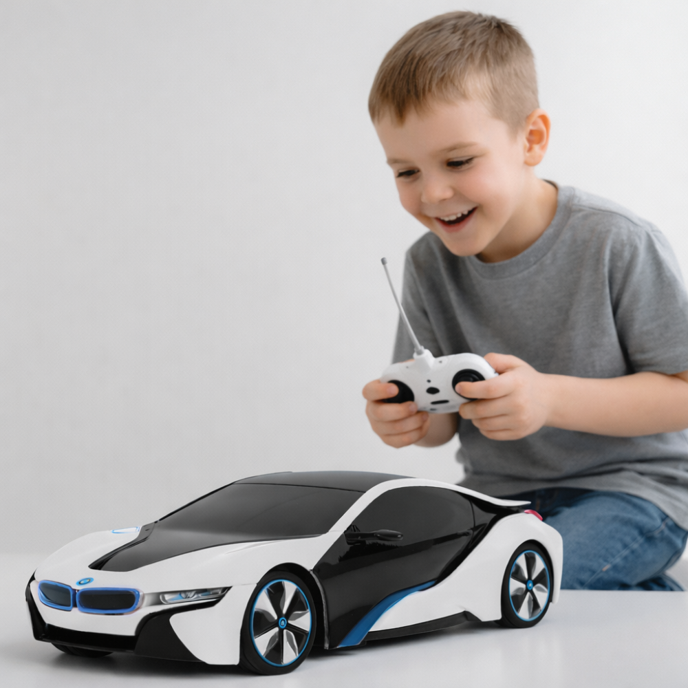 Masina cu telecomanda R/C BMW i8 1:24, marca RASTAR (cu licenta), este un model deosebit, realizat cu maxima atentie la detalii, special conceput pentru copiii pasionati de automobile premium si joaca dinamica. Acest model reproduce fidel celebrul BMW i8, oferind o experienta de condus realista si captivanta.
