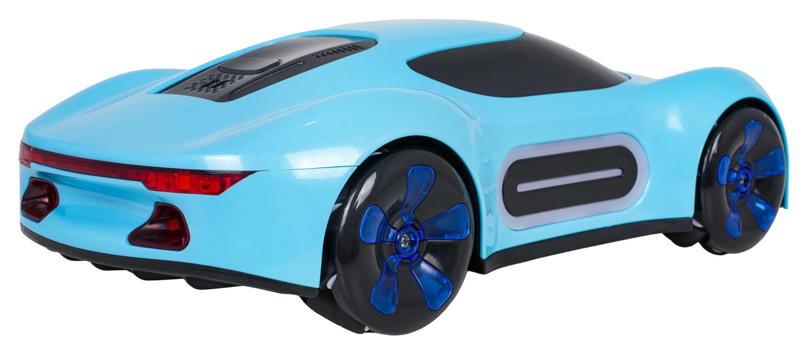 Masina este echipata cu lumini in fata, spate, pe laterale si in roti, oferind un efect vizual deosebit in timpul jocului. O caracteristica speciala este functia de fum: dupa umplerea rezervorului cu apa, vehiculul elimina fum prin doua orificii din spate, sporind realismul si distractia.