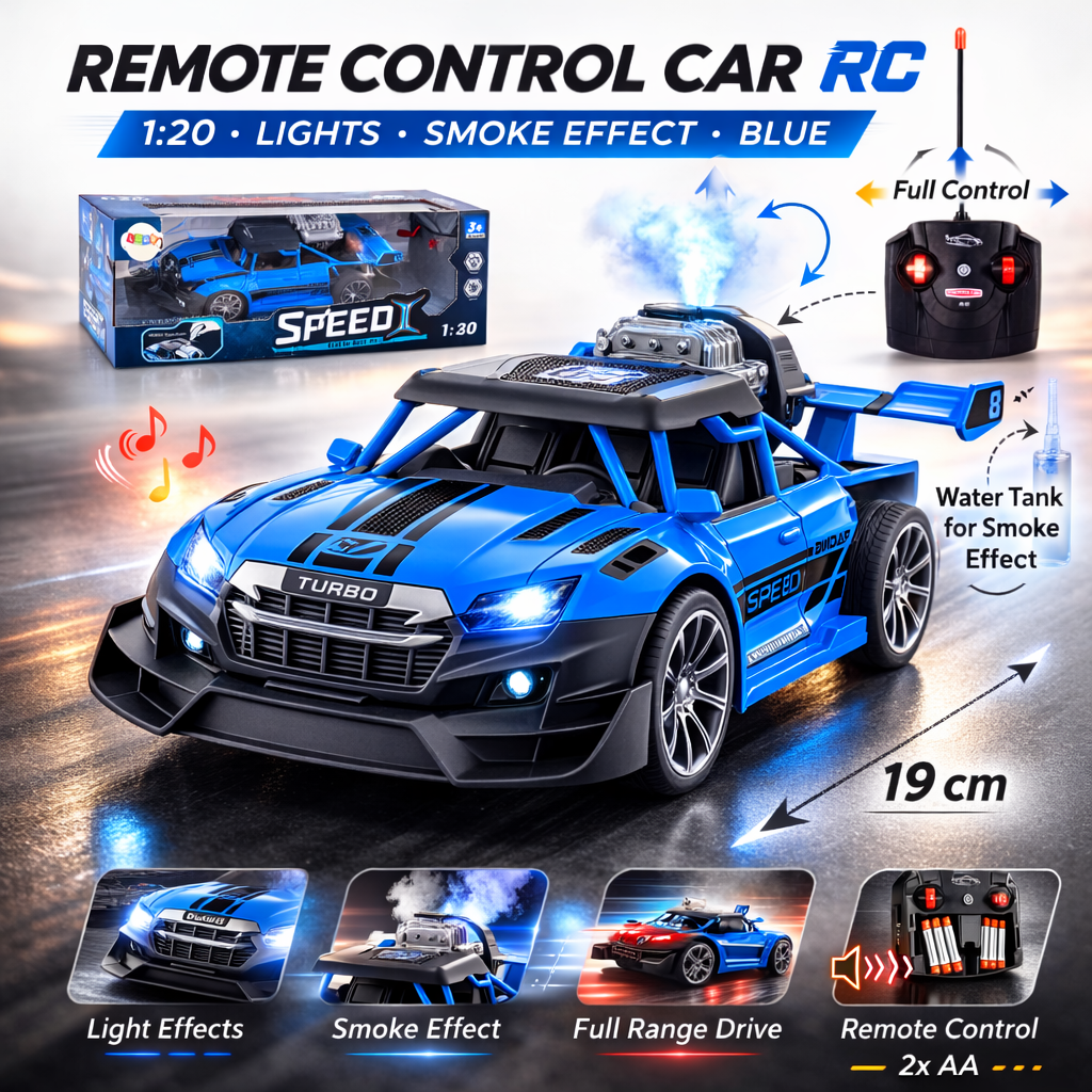 MASINA RC CU EFECT FUM ALBASTRA 1:20