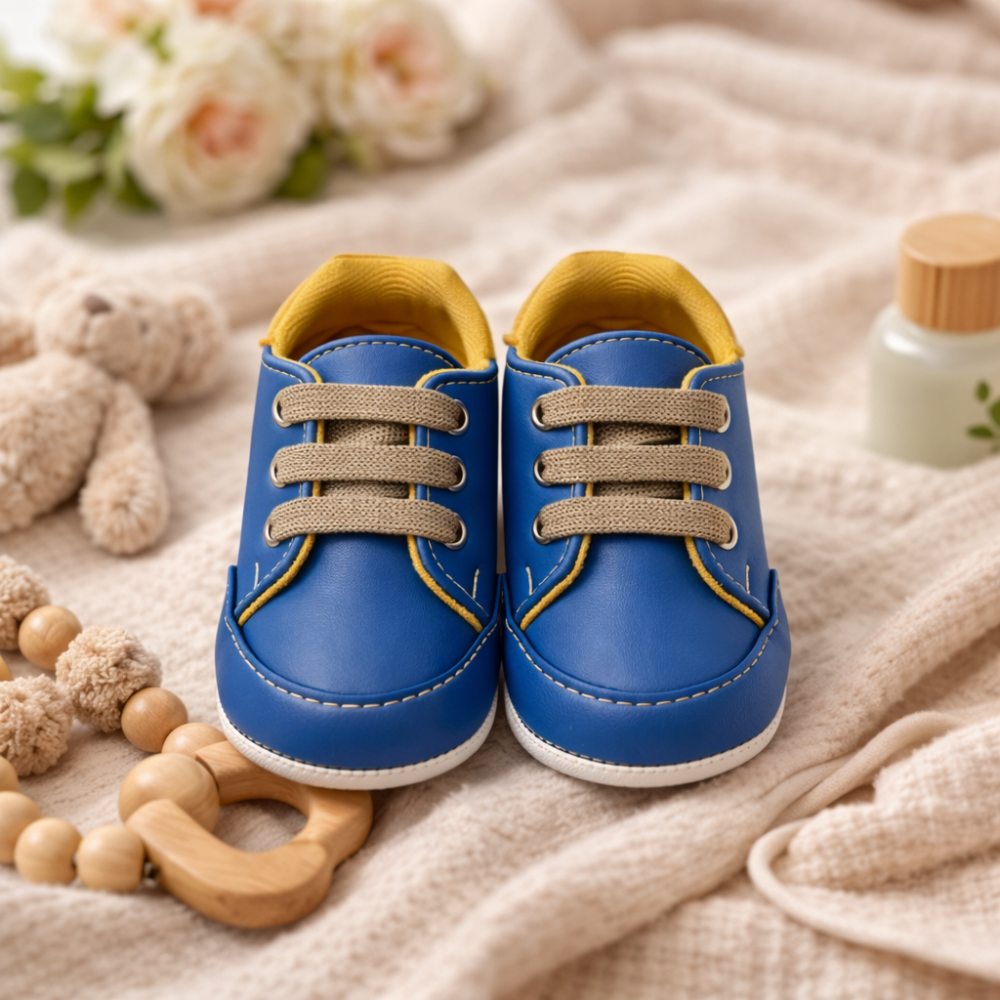 Adidasi pentru bebelusi cu design modern tip tenisi, realizati in combinatie de albastru cu interior deschis si sireturi bej. Modelul este atent finisat, cu cusaturi vizibile si talpa alba usoara, oferind un aspect placut si echilibrat.