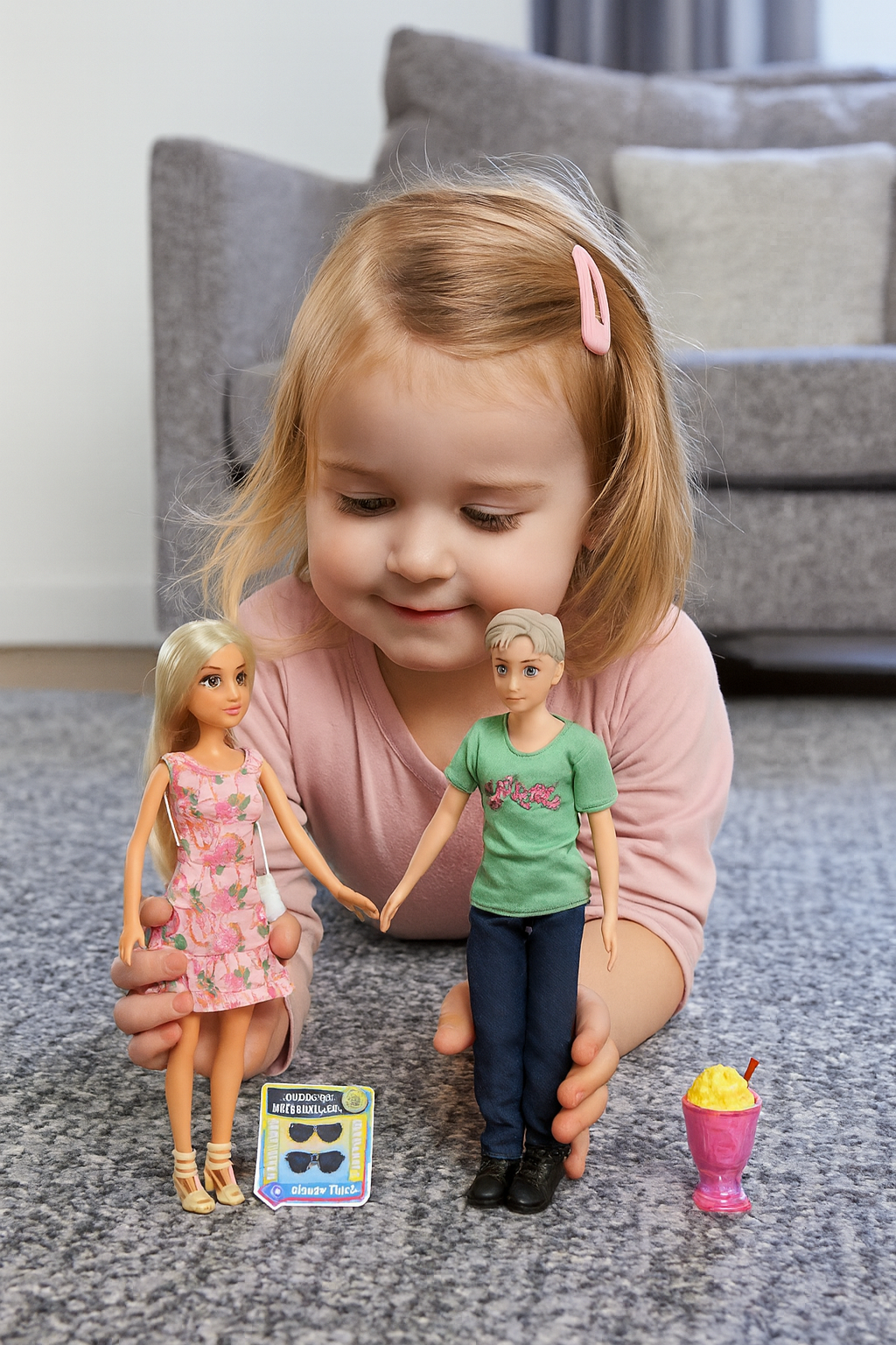 Accesoriile incluse adauga valoare jocului si realism scenariilor: doua perechi de ochelari de soare, un pahar de suc, chipsuri si o punga de tip sac – toate contribuie la crearea unor situatii realiste inspirate din viata de zi cu zi, cum ar fi iesiri la cafenea, plimbari sau intalniri.