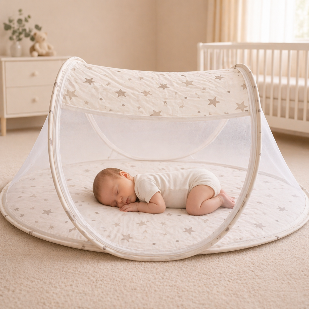 Structura usoara si sistemul rapid de pliere permit utilizarea imediata si transportul fara efort. Suprafata moale si stabila sustine pozitia naturala de somn a bebelusului, iar marginile protejate asigura un plus de siguranta.