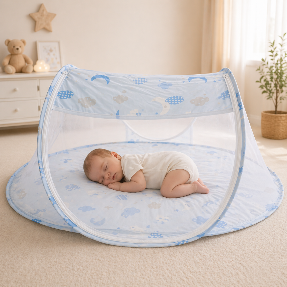 BEBELUL Patut pliabil cu plasa protectie tantari pentru bebelusi, portabil - Albastru