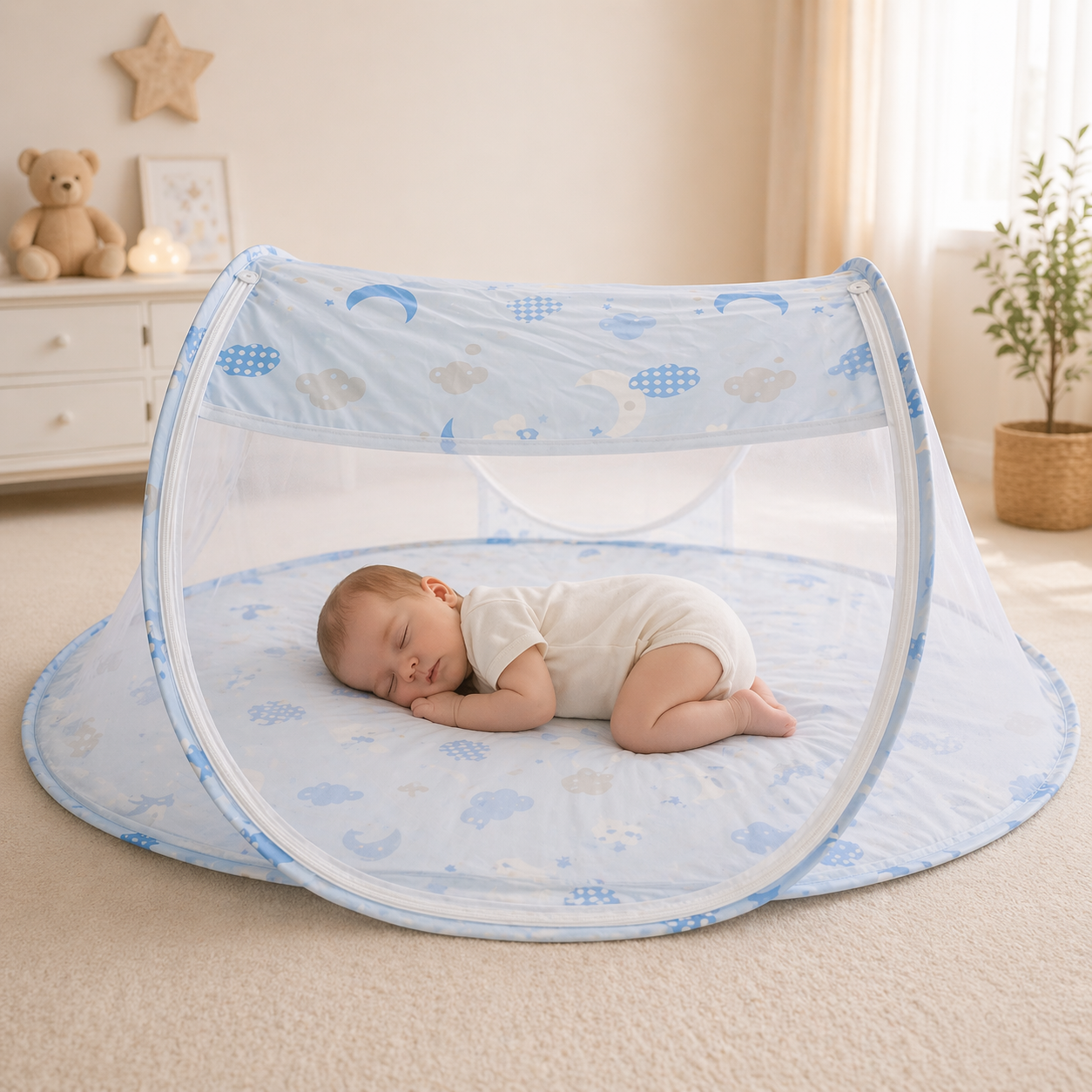 Patut pliabil pentru bebelusi, cu plasa protectie insecte, usor de transportat si rapid de montat, ideal pentru somn sigur oriunde.