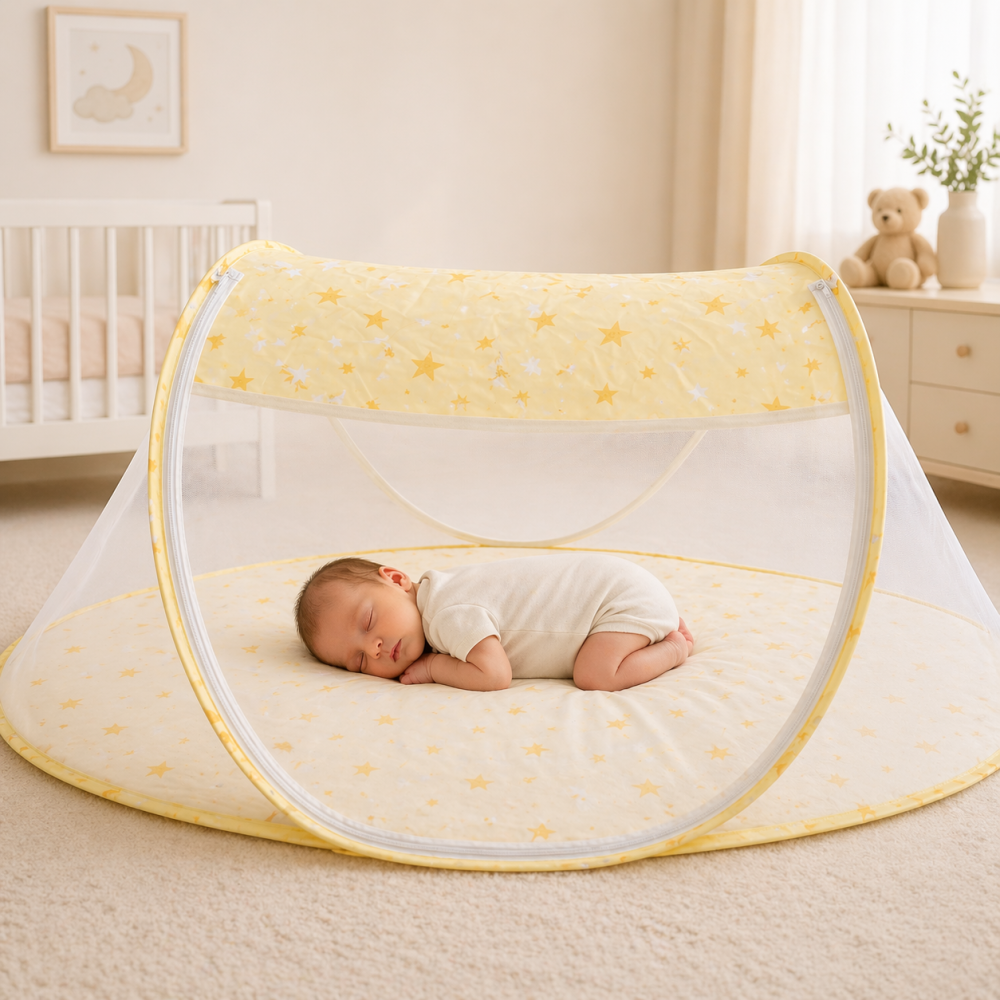 BEBELUL Patut pliabil cu plasa protectie tantari pentru bebelusi, portabil - Galben