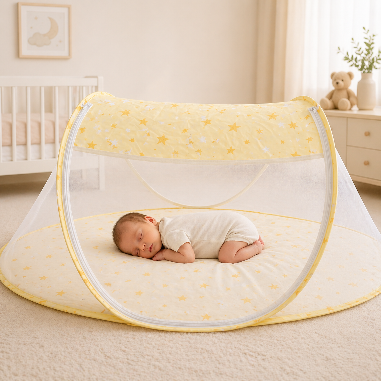 Structura usoara si sistemul rapid de pliere permit utilizarea imediata si transportul fara efort. Suprafata moale si stabila sustine pozitia naturala de somn a bebelusului, iar marginile protejate asigura un plus de siguranta.