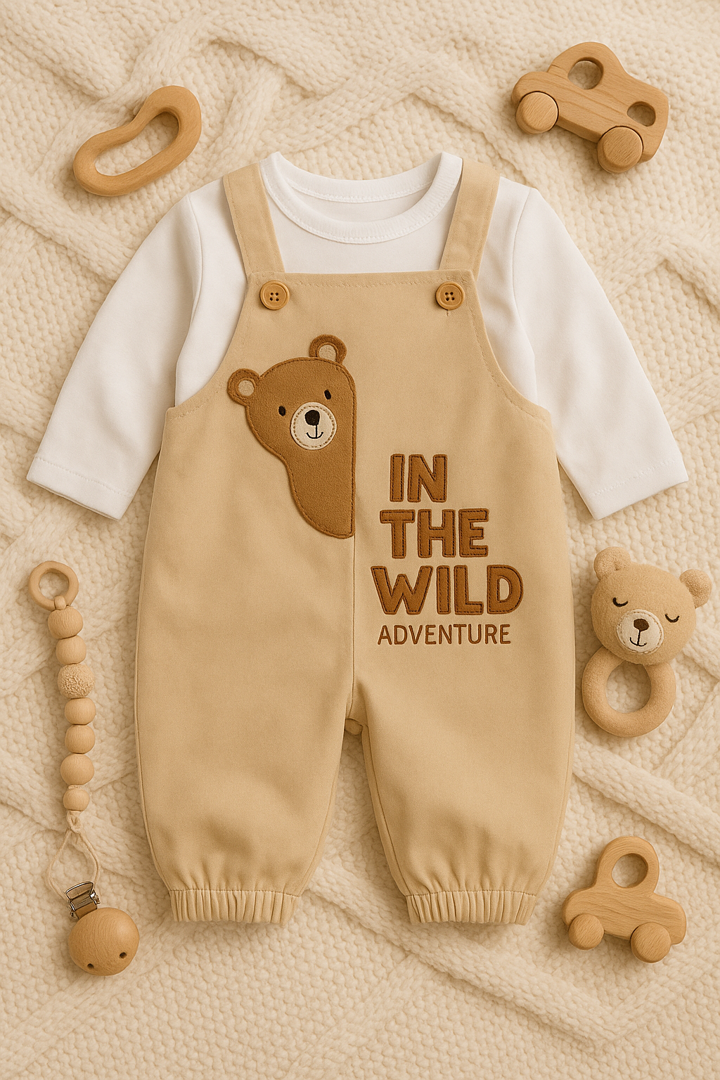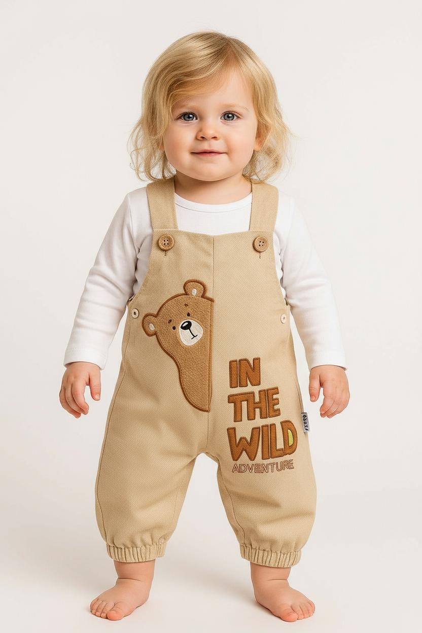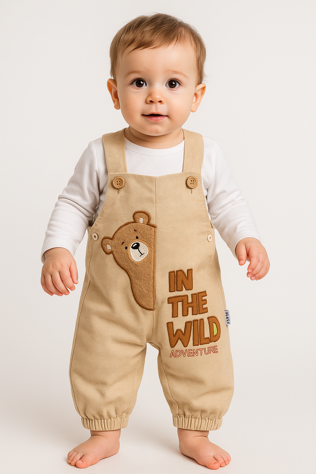 Salopetă pentru băieței, confecționată din 100% bumbac, plăcută la atingere și delicată cu pielea fină a bebelușului. Model cu ursuleț aplicat, exact ca în poză, și text brodat “In The Wild Adventure”, ideală pentru joacă și explorare. Bretele cu butoane, ușor de reglat, și elastic la glezne pentru o fixare comodă. Recomandată a se spăla la maximum 30°C.