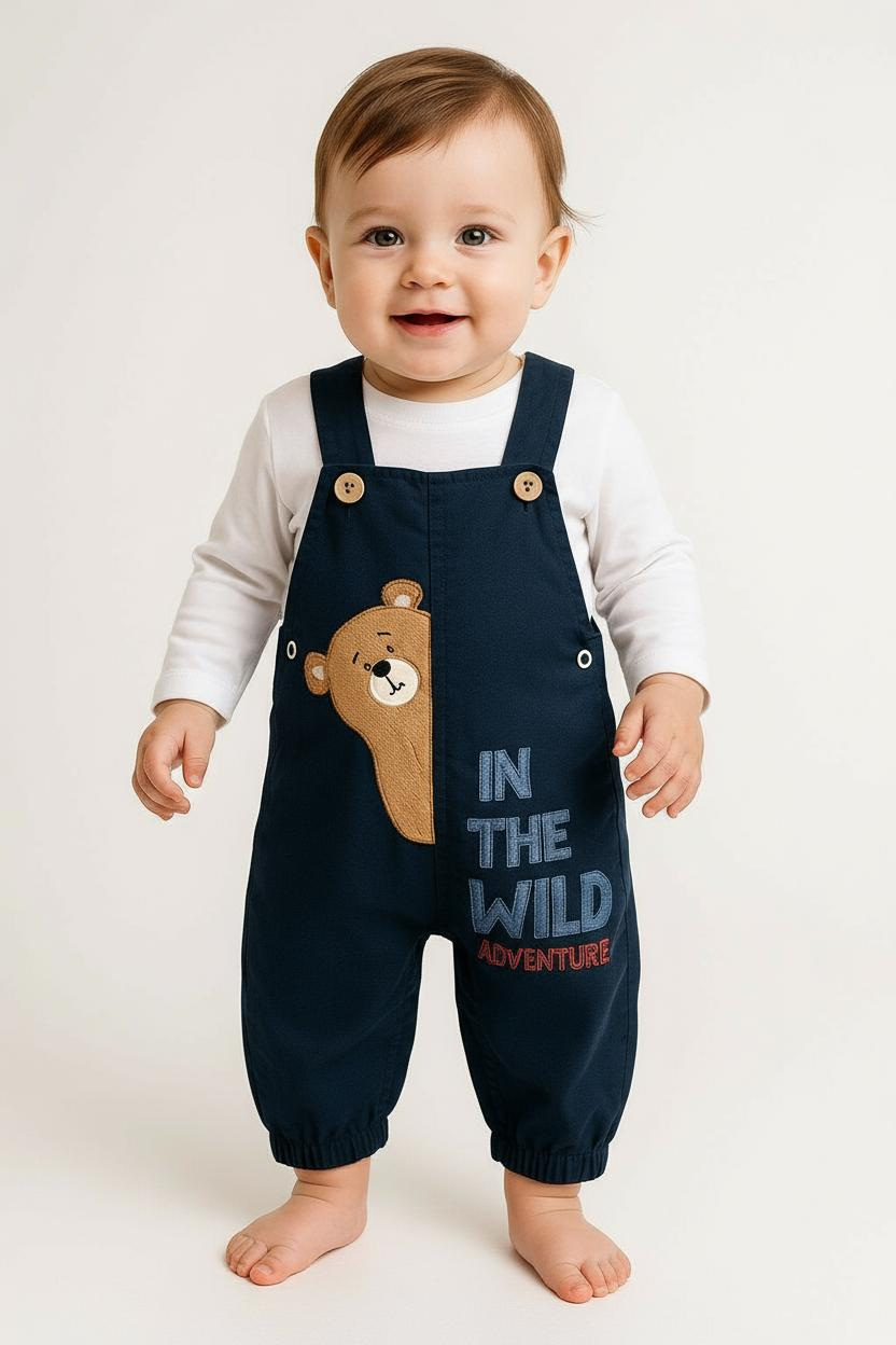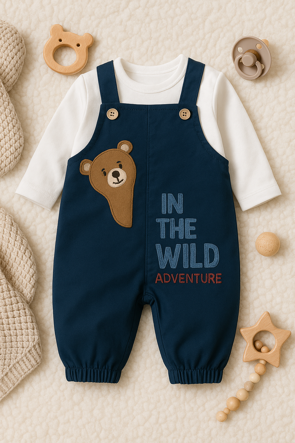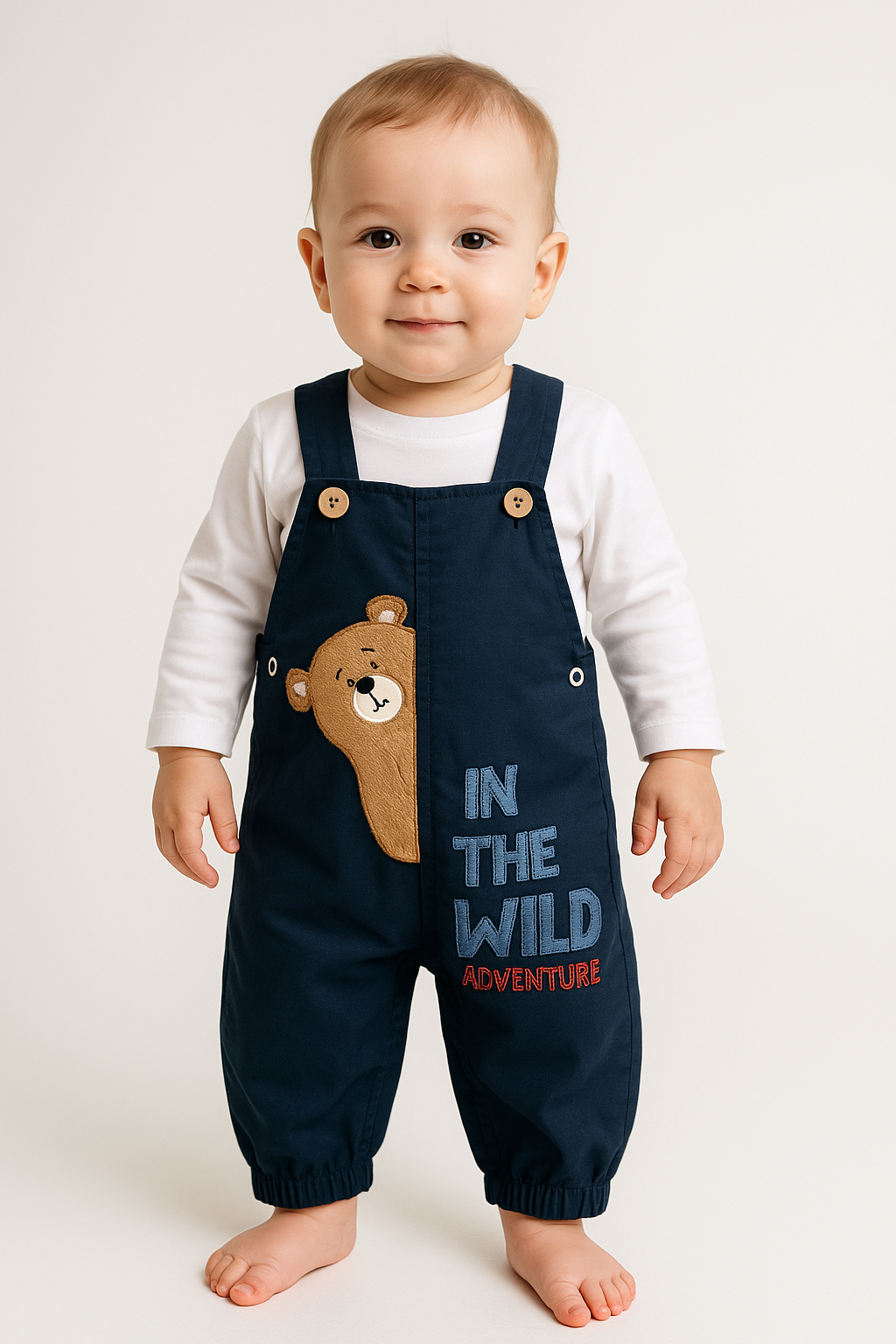 Salopetă pentru băieței, confecționată din 100% bumbac, plăcută la atingere și delicată cu pielea fină a bebelușului. Model cu ursuleț aplicat, exact ca în poză, și text brodat “In The Wild Adventure”, ideală pentru joacă și explorare. Bretele cu butoane, ușor de reglat, și elastic la glezne pentru o fixare comodă. Recomandată a se spăla la maximum 30°C.