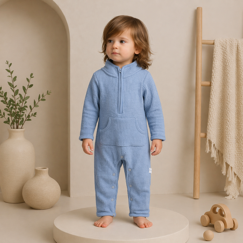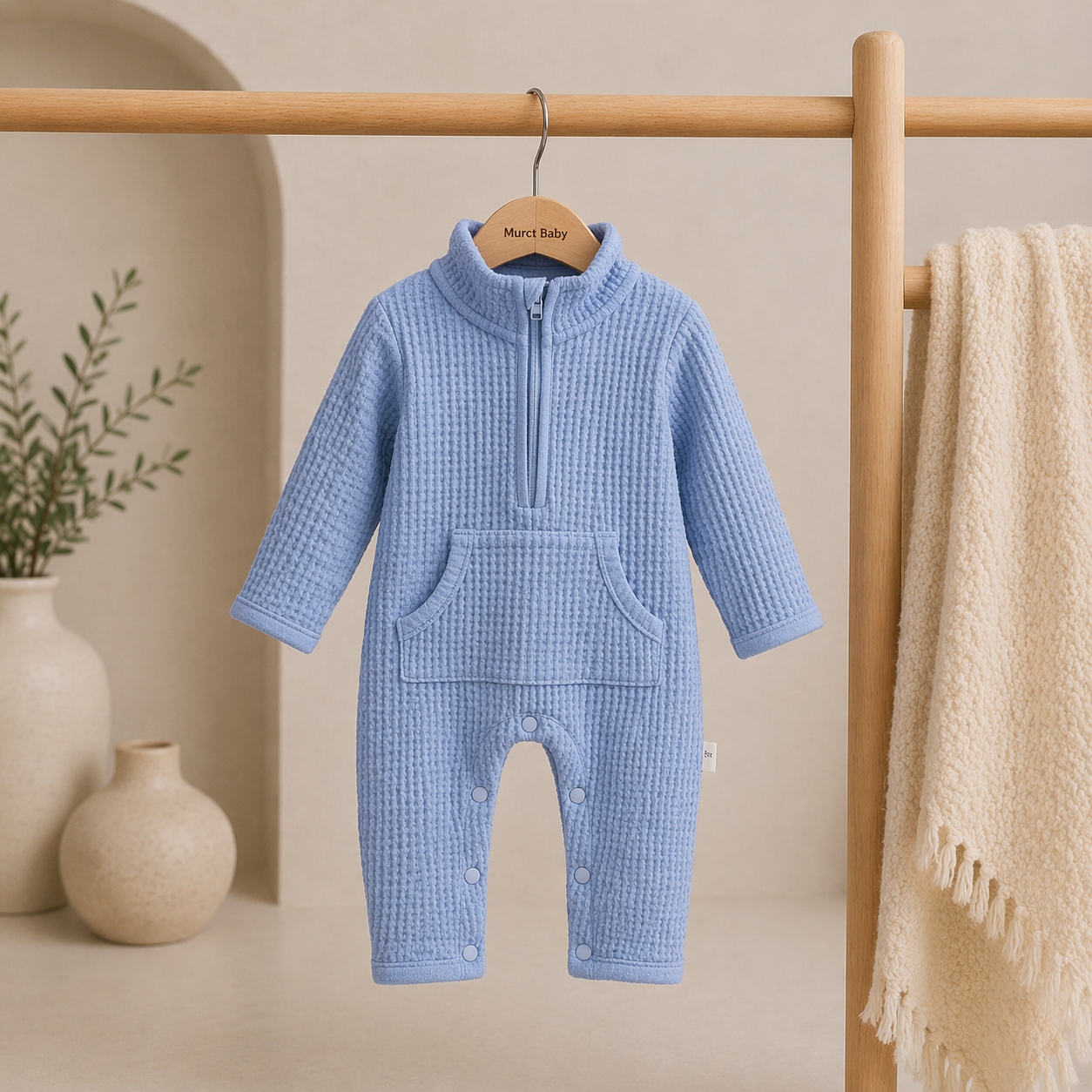 Materialul waffle este moale, respirabil si placut la atingere, oferind confort pe tot parcursul zilei si fiind prietenos cu pielea sensibila a bebelusului. Designul cu fermoar pe jumatate permite imbracare usoara si rapida, iar capsele din partea de jos ajuta la schimbarea simpla a scutecului.