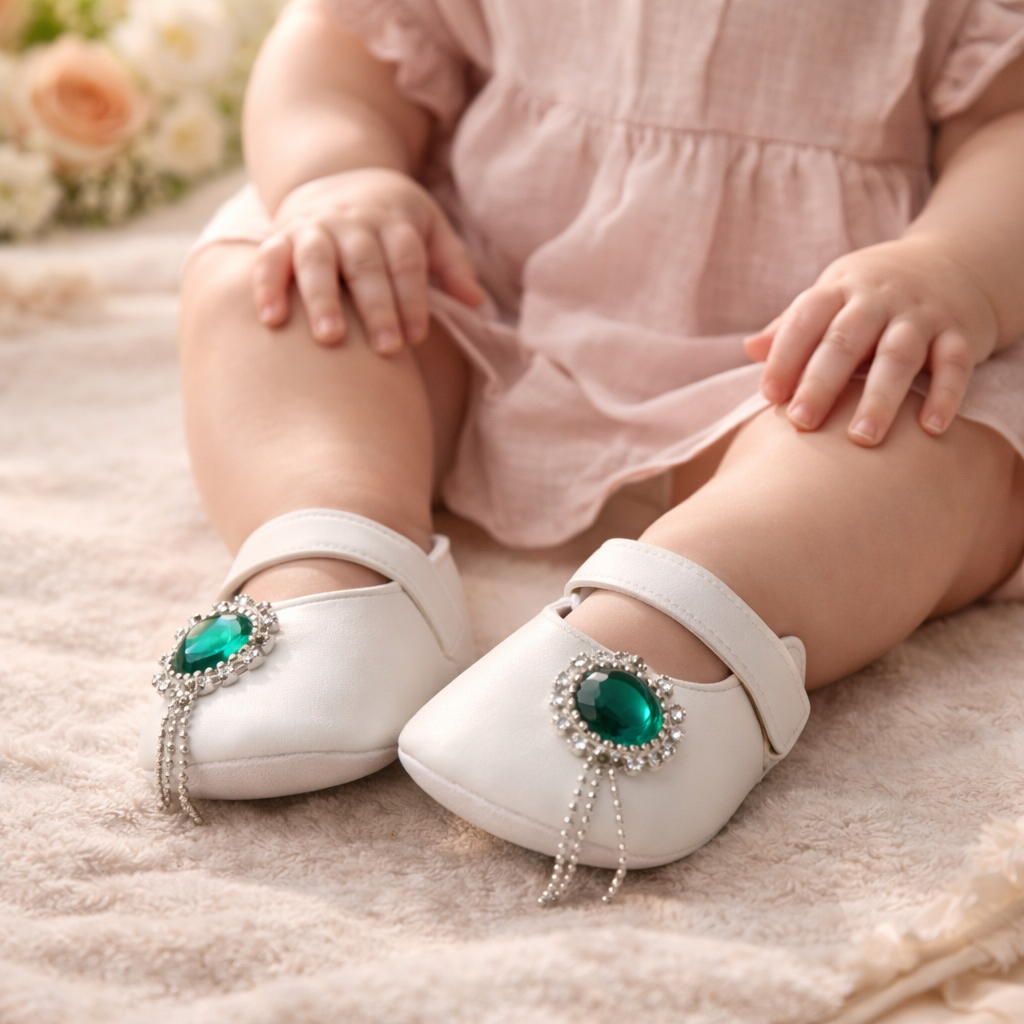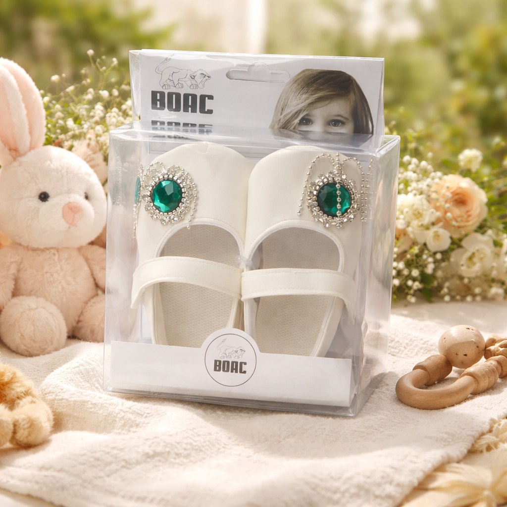 Sandalute elegante pentru fetite, marca BOAC, de culoare alba, decorate cu o piatra verde stralucitoare si detalii fine tip bijuterie, ce ofera un aspect delicat si rafinat. Sistemul de inchidere cu bareta asigura o fixare usoara si sigura pe piciorus.