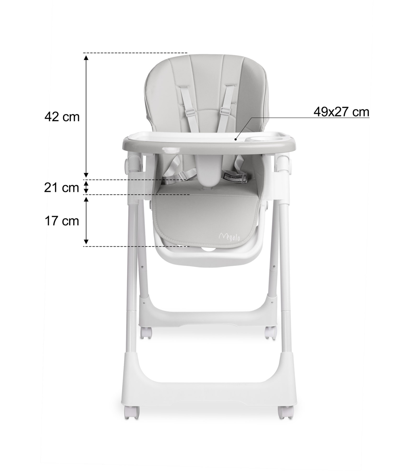 Scaunul de hranire pliabil Megalo este usor si confortabil. Greutatea redusa si posibilitatea de pliere la dimensiuni compacte reprezinta punctele forte ale produsului. Sezutul spatios cu tava reglabila si centurile de siguranta asigura o hranire confortabila. Tapiteria din piele ecologica este usor de indepartat si curatat. Reglajul pe inaltime permite alegerea pozitiei optime, iar rotile cauciucate cu blocare faciliteaza deplasarea fara a deteriora podeaua.
