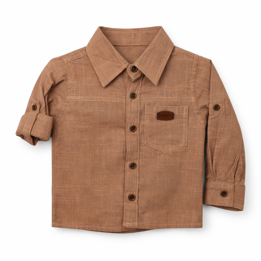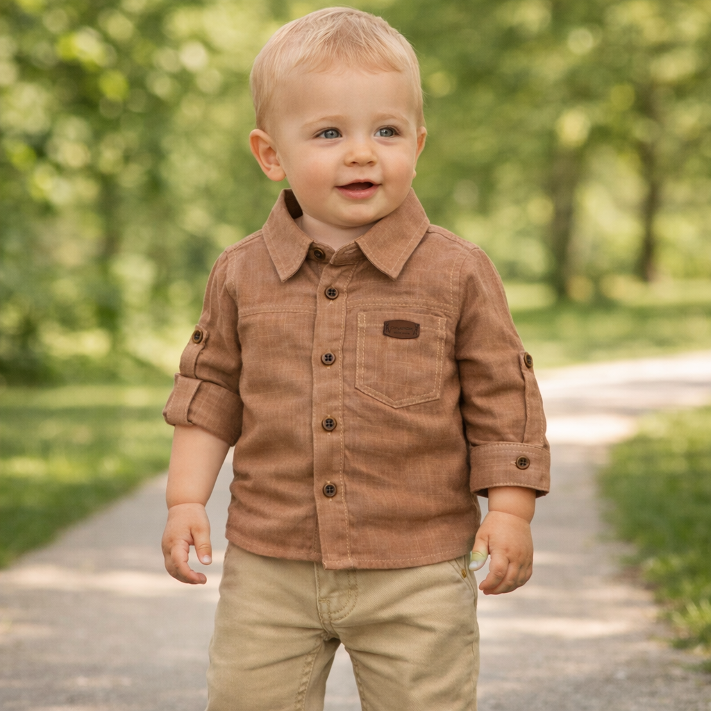 Set elegant pentru baieti compus din camasa cu maneca lunga si pantaloni, ideal pentru tinute casual sau evenimente speciale. Camasa maro are un design simplu si modern, cu guler clasic, nasturi contrastanti si buzunar decorativ, oferind un aspect cald si rafinat. Manecile pot fi purtate lungi sau suflecate pentru un stil mai relaxat.