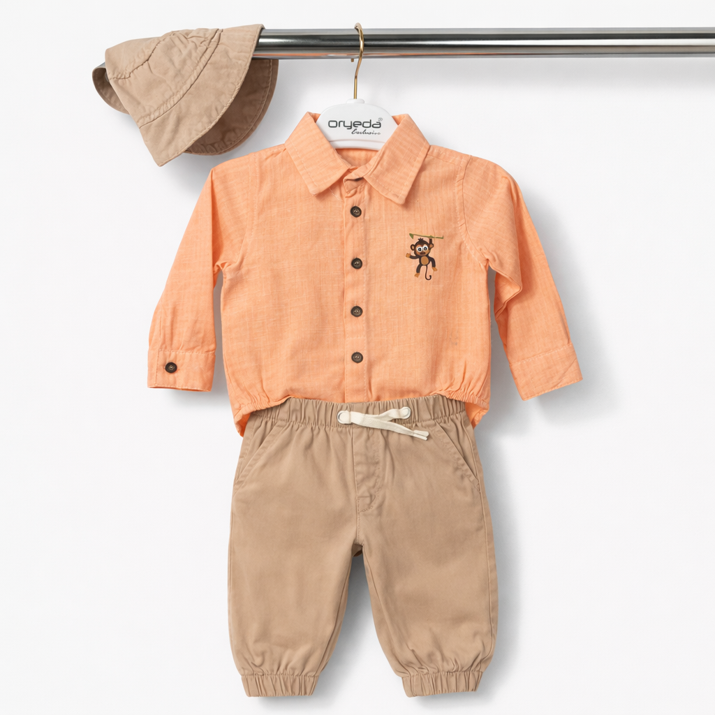 Set complet pentru bebelusi, compus din camasa tip body cu maneca lunga, pantaloni cu snur si palarie asortata. Camasa este realizata din material usor si placut la atingere, prevazuta cu nasturi frontali si imprimeu discret cu maimutica, oferind un aspect jucaus si elegant in acelasi timp. Designul tip body asigura fixare perfecta si confort pe durata purtarii.