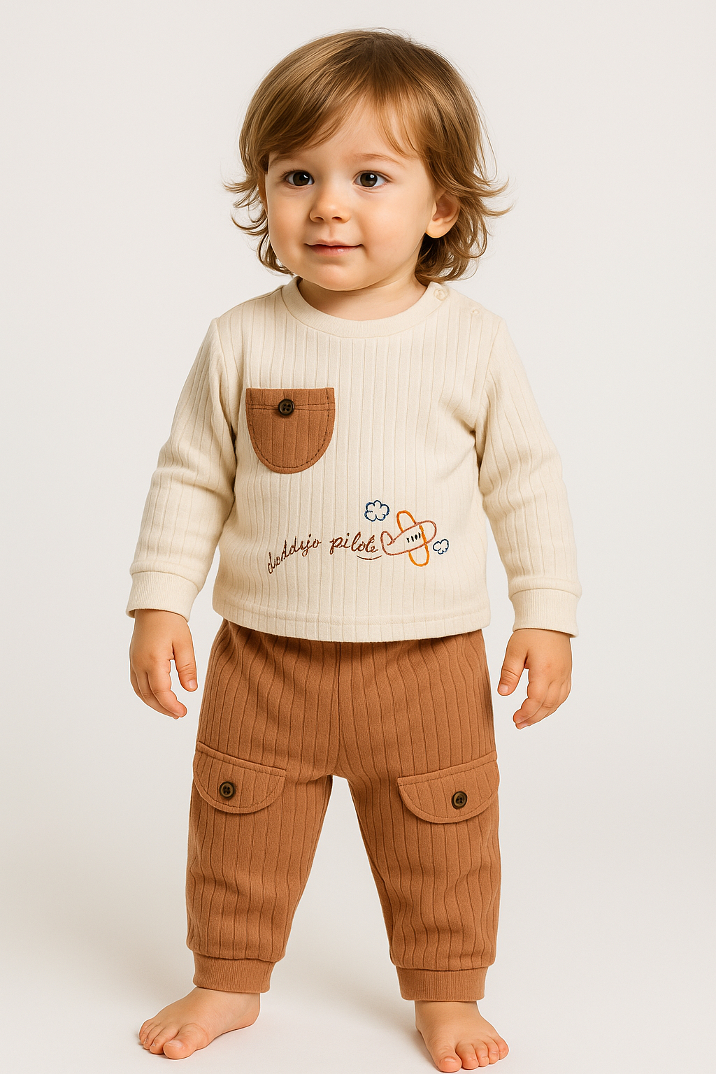 Costum pentru bebeluși Naffito, realizat din 100% bumbac pieptănat, moale și plăcut pe pielea sensibilă a celor mici. Bluziță crem cu buzunar aplicat în nuanță albastră și broderie drăgălașă cu avion, perfectă pentru ținute jucăușe de zi cu zi. Pantaloni în aceeași gamă de culori, cu buzunare laterale cu nasture, confortabili și practici. Ușor de îmbrăcat, rezistent la spălări și foarte comod în purtare.
