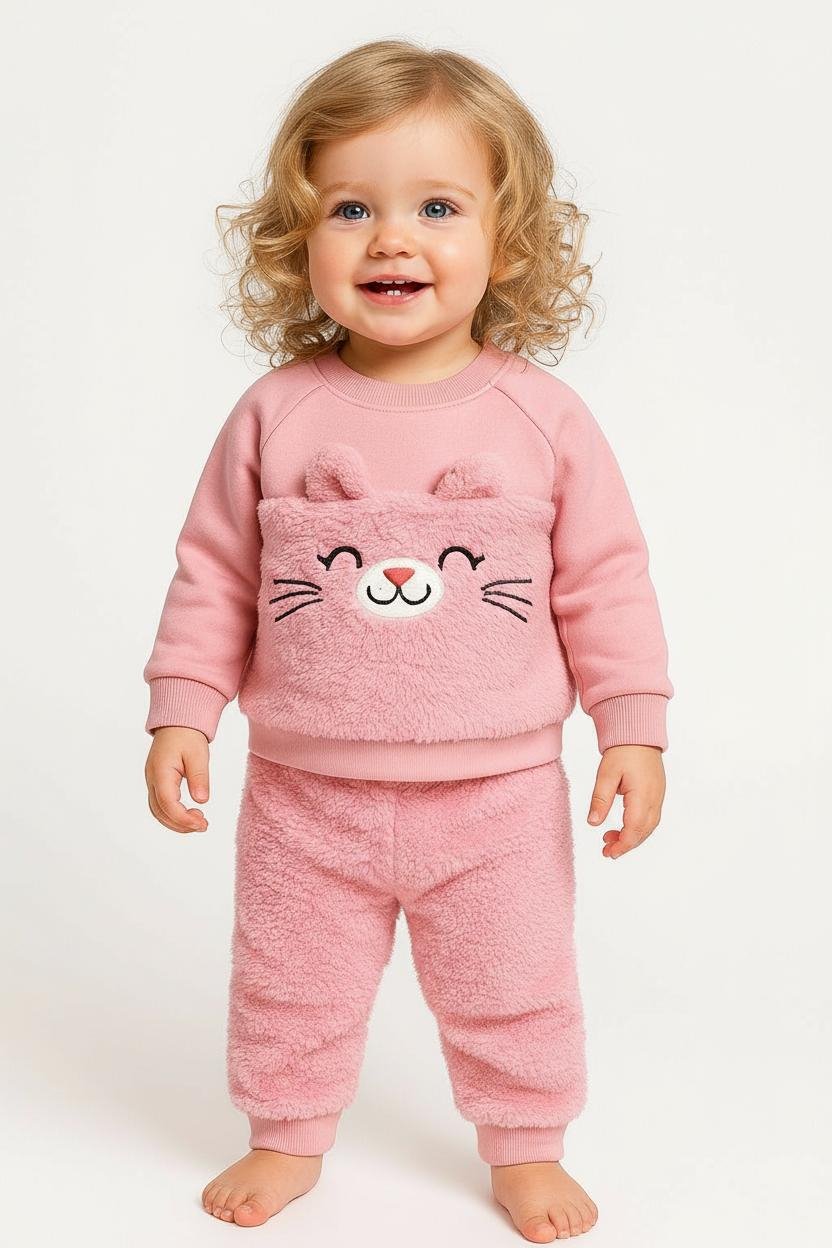 Pantalonii asortati sunt la fel de caldurosi, din acelasi material pufos, cu talie elastica moale ce nu strange si nu incomodeaza burtica bebelusului. Mansetele la glezne mentin pantalonii la locul lor, oferind libertate de miscare si confort pe tot parcursul zilei.