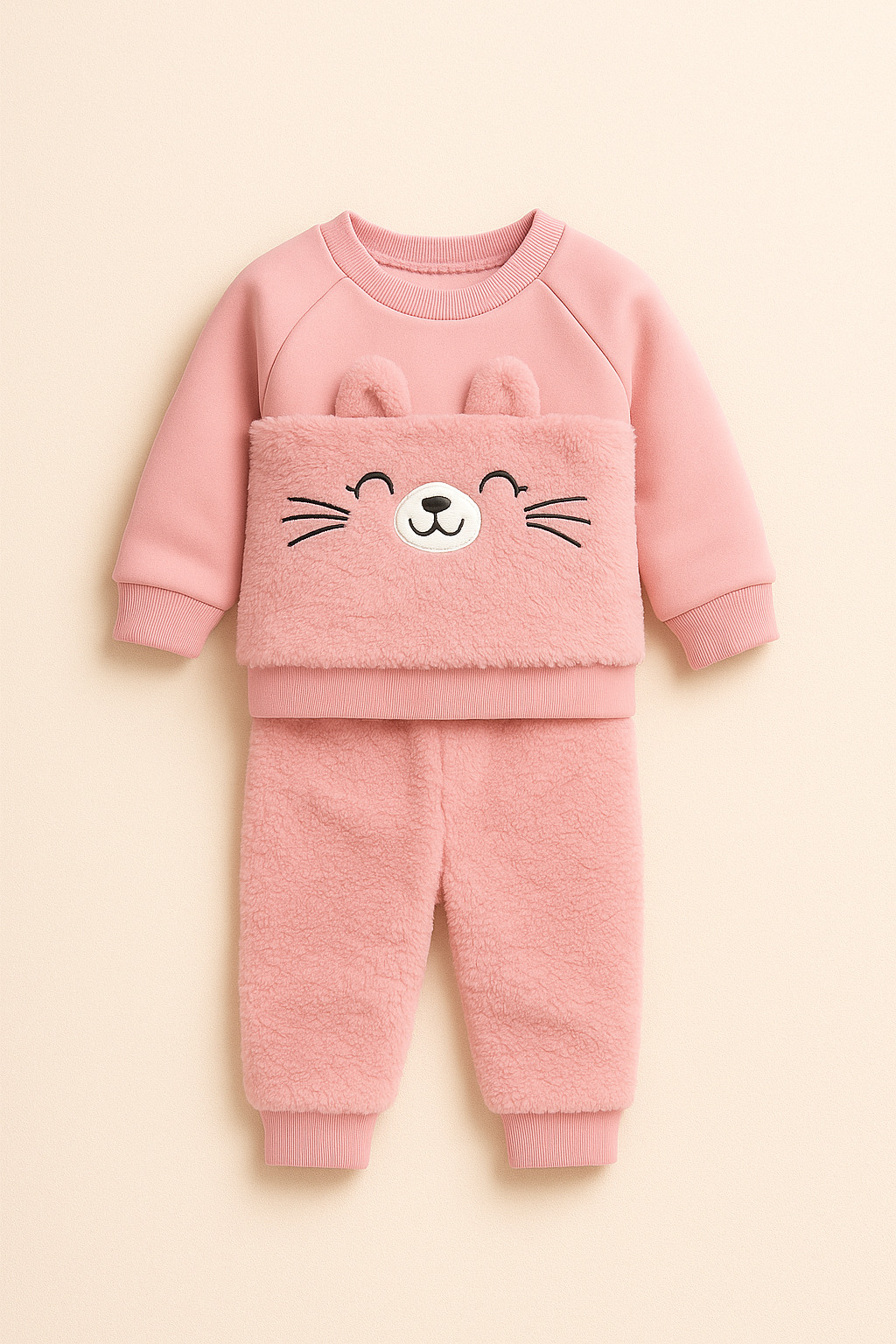 Bluza are un design prietenos, cu aplicatie pufoasa in forma de catelus/animalut zambitor si urechi tridimensionale, care adauga un efect adorabil. Mansetele elastice asigura o fixare confortabila si permit imbracarea usoara.