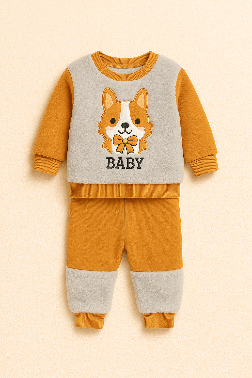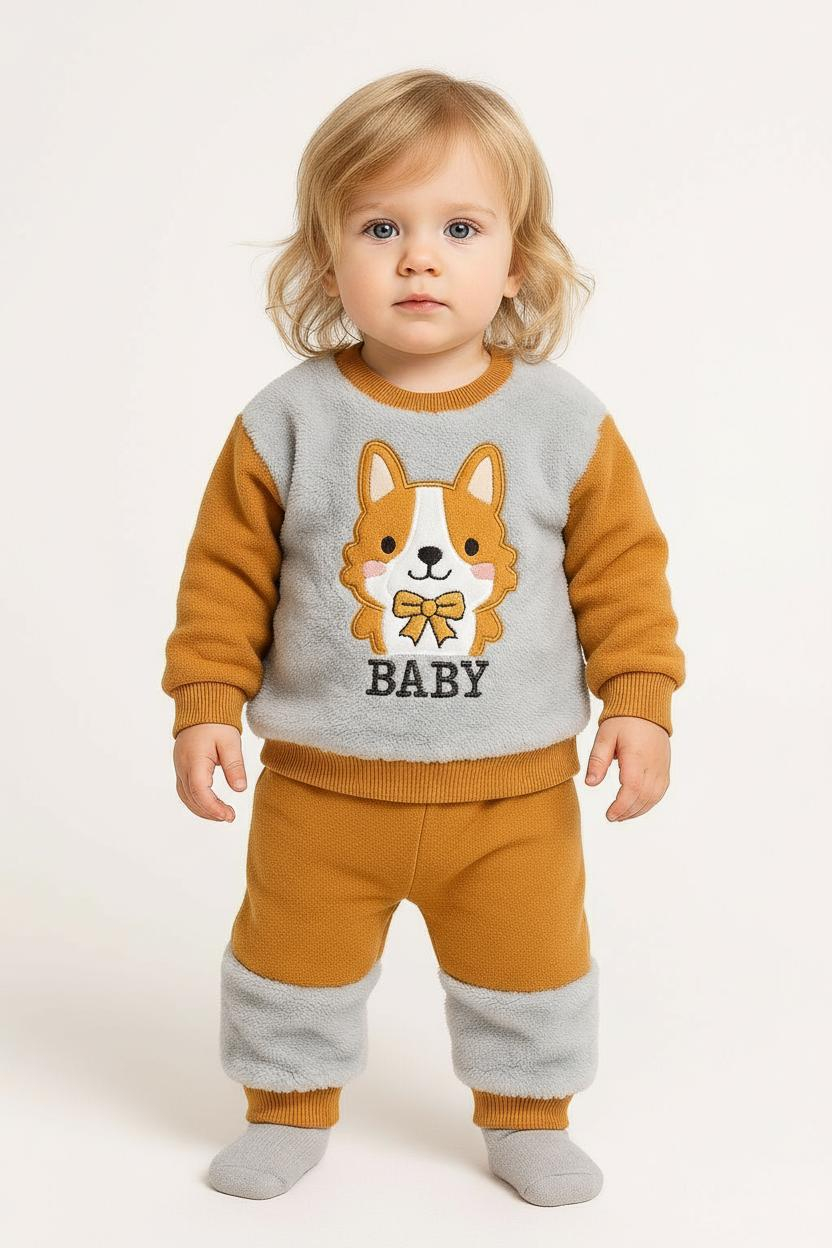 Bluza are o textura pufoasa pe partea frontala si un imprimeu adorabil cu vulpita, realizat in tonuri calde. Manecile si terminatiile sunt prevazute cu mansete elastice ce pastreaza forma si fac imbracarea usoara. Pantalonii asortati au talie elastica moale, care nu strange burtica, si zone pufoase pe picioruse, oferind un plus de caldura si stil.