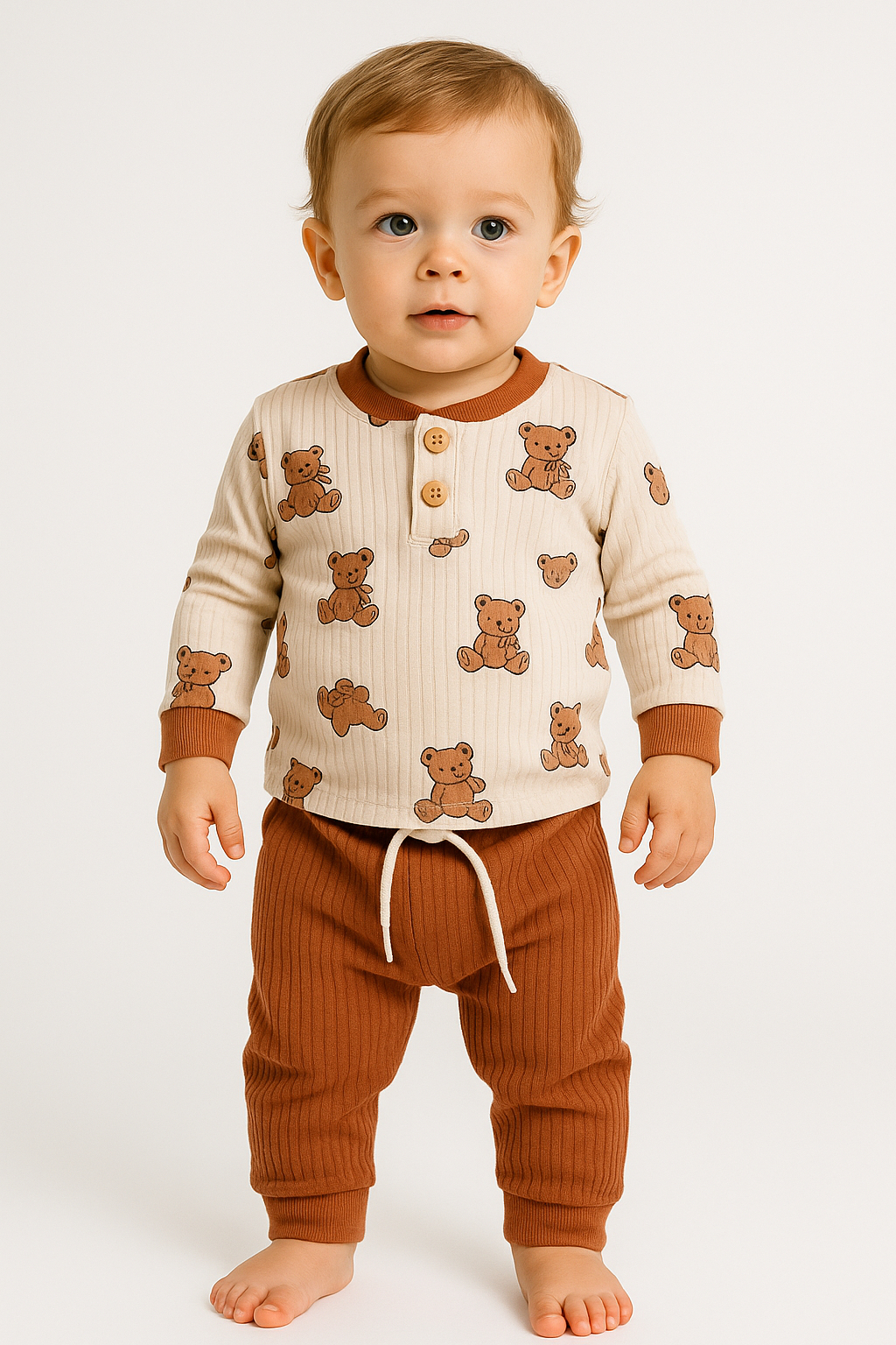 Gandit pentru pielea sensibila a bebelusilor, Setul cu bluzita si pantaloni Teddy Bear Dolas Kids este o alegere confortabila, sigura si estetica pentru fiecare zi. Setul contine 2 piese asortate: