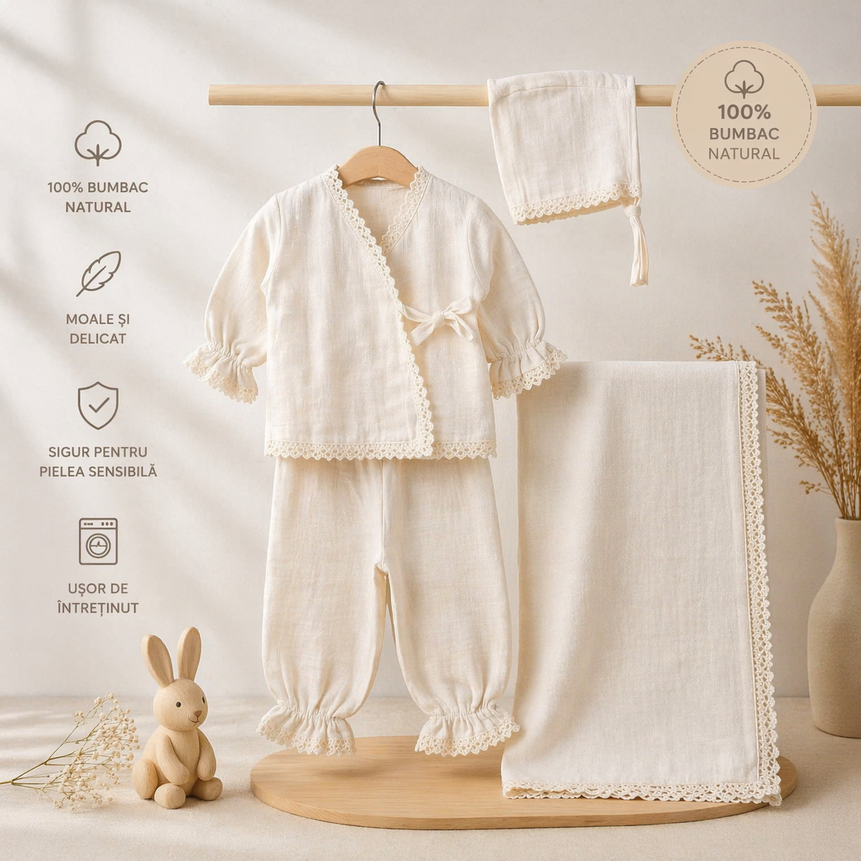Set bebe 3 piese din muselina bumbac cu bluza, pantaloni, boneta si paturica, ideal pentru confort si eleganta in primele luni.