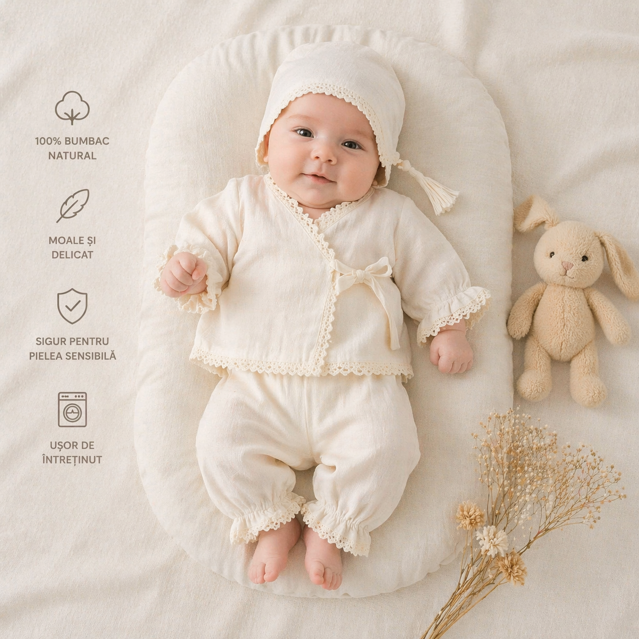 Materialul respirabil permite pielii sa respire si previne supraincalzirea, fiind ideal pentru pielea sensibila a nou-nascutilor. Designul simplu, in nuanta crem naturala, cu detalii fine din dantela, adauga un aspect premium si elegant.