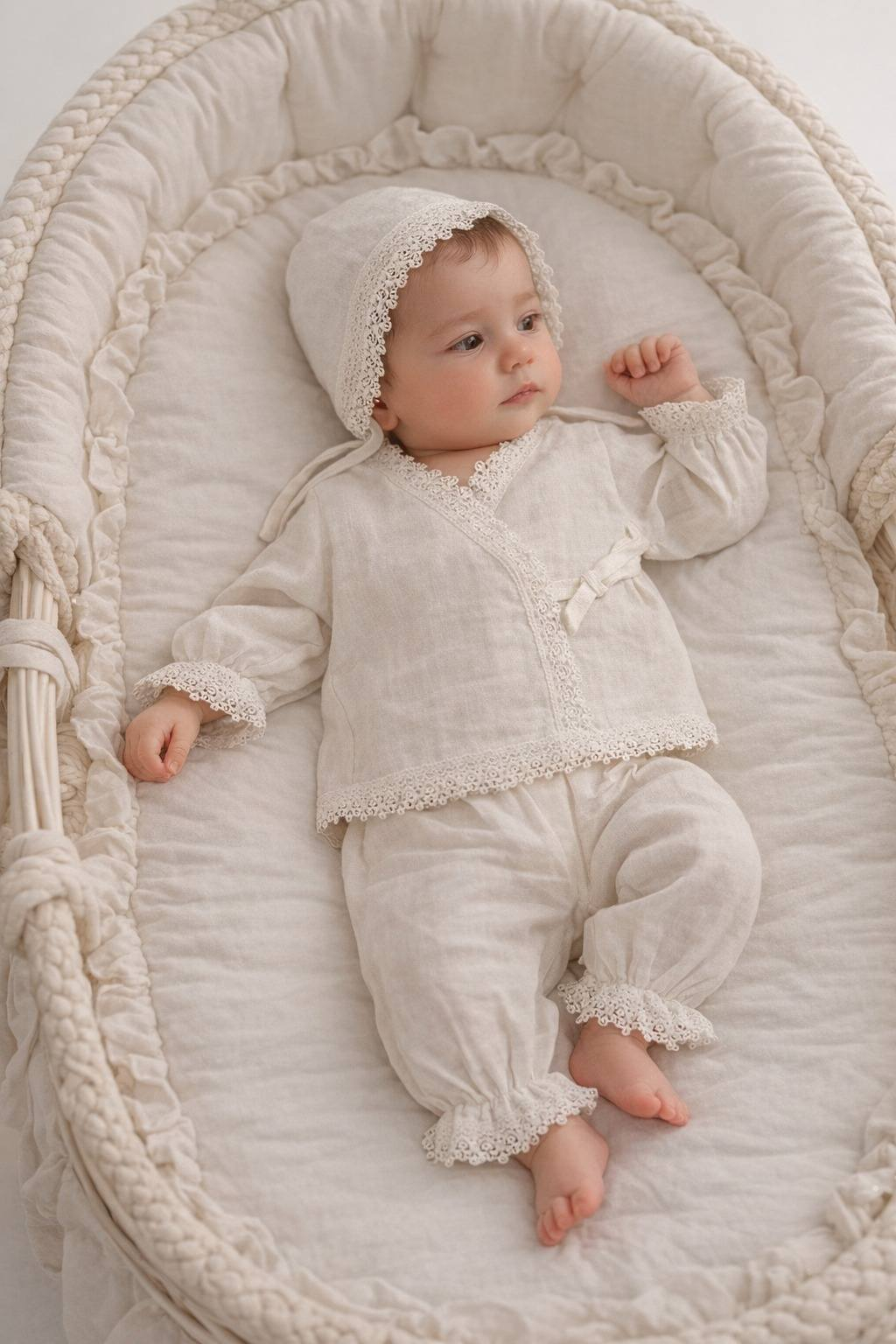 Un set delicat si elegant pentru bebelusi, perfect pentru primele luni de viata. Realizat din muselina fina din bumbac 100%, acest set ofera confort maxim si libertate de miscare, fiind ideal atat pentru somn, cat si pentru momente speciale sau iesiri.