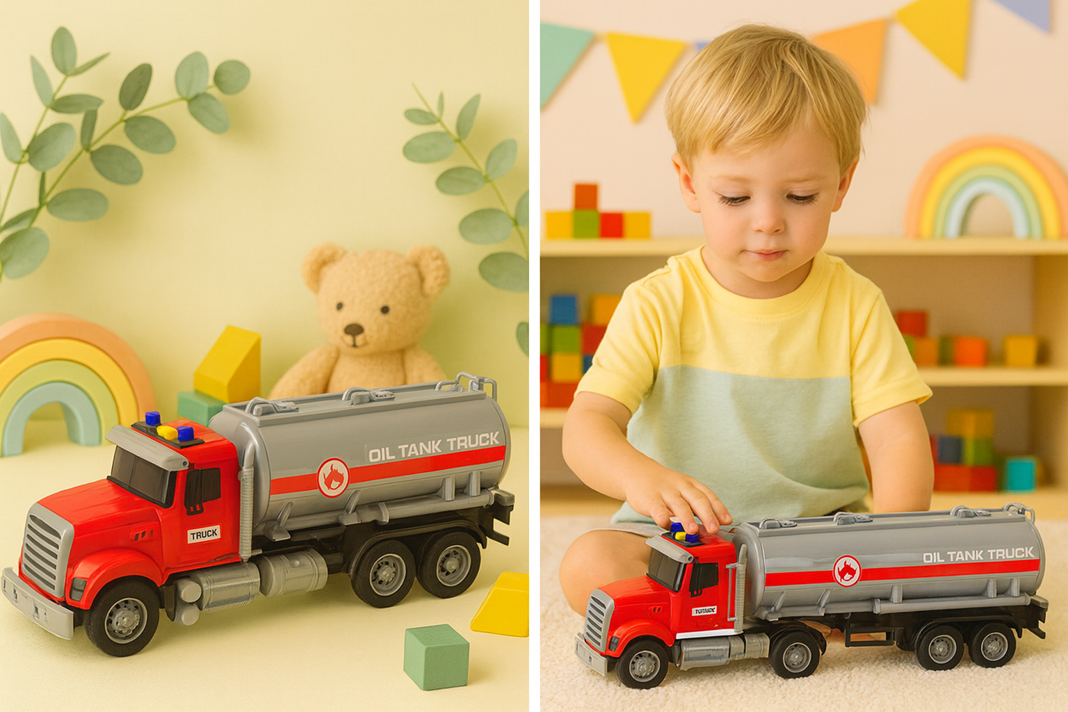 Un alt avantaj al acestui camion este cisterna detasabila, care permite transportul si descarcarea diferitelor tipuri de marfuri. Copilul se poate juca transportand combustibil, apa sau alte substante, stimuland astfel imaginatia si incurajand gandirea creativa. Joaca cu un astfel de set contribuie, de asemenea, la dezvoltarea abilitatilor manuale si a coordonarii motorii, sustinand în acelasi timp invatarea planificarii si a gandirii logice.