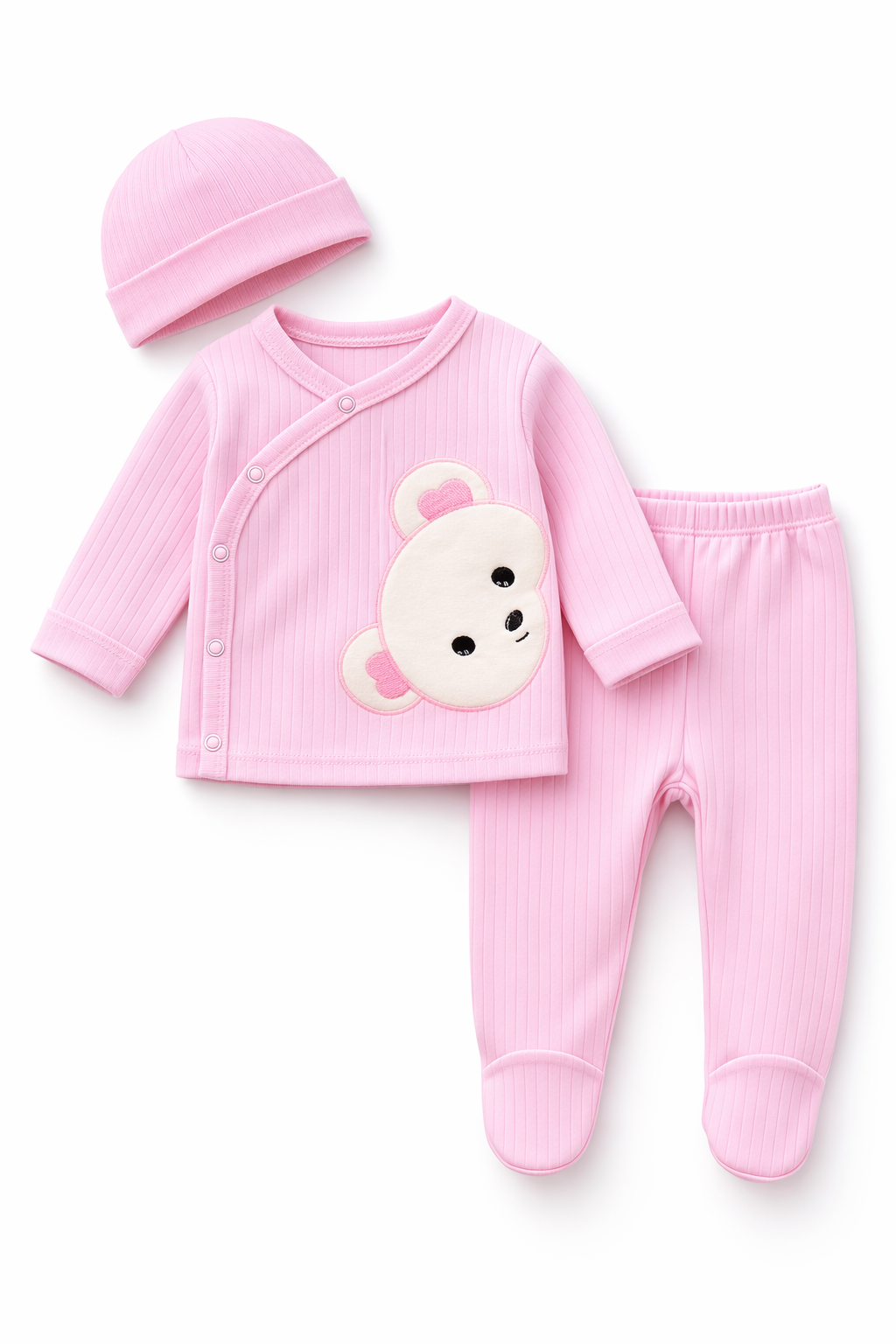 Designul elegant cu material usor texturat si model discret in dungi ofera setului un aspect modern si delicat. In partea frontala se regaseste o broderie adorabila cu ursulet, care adauga un plus de farmec tinutei.