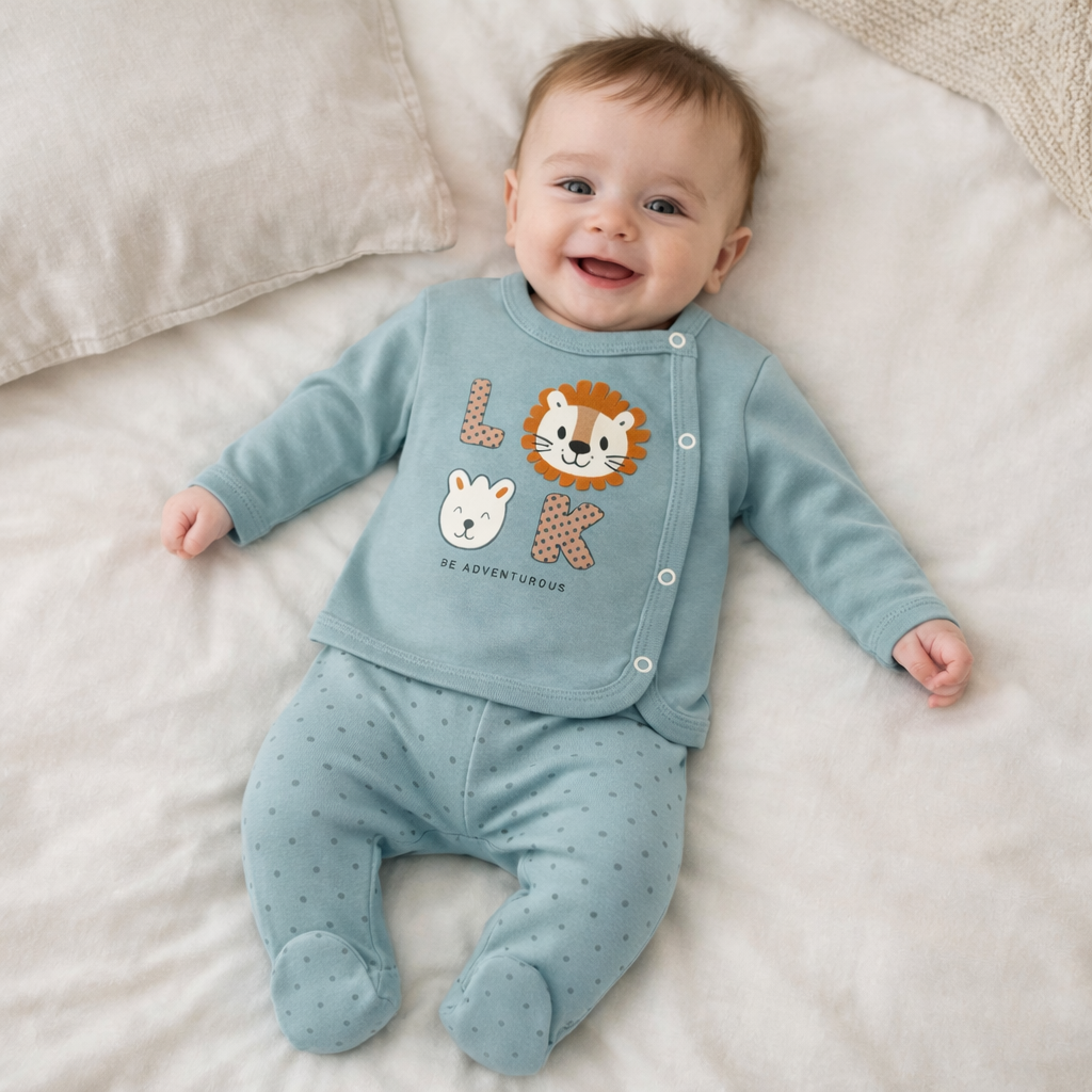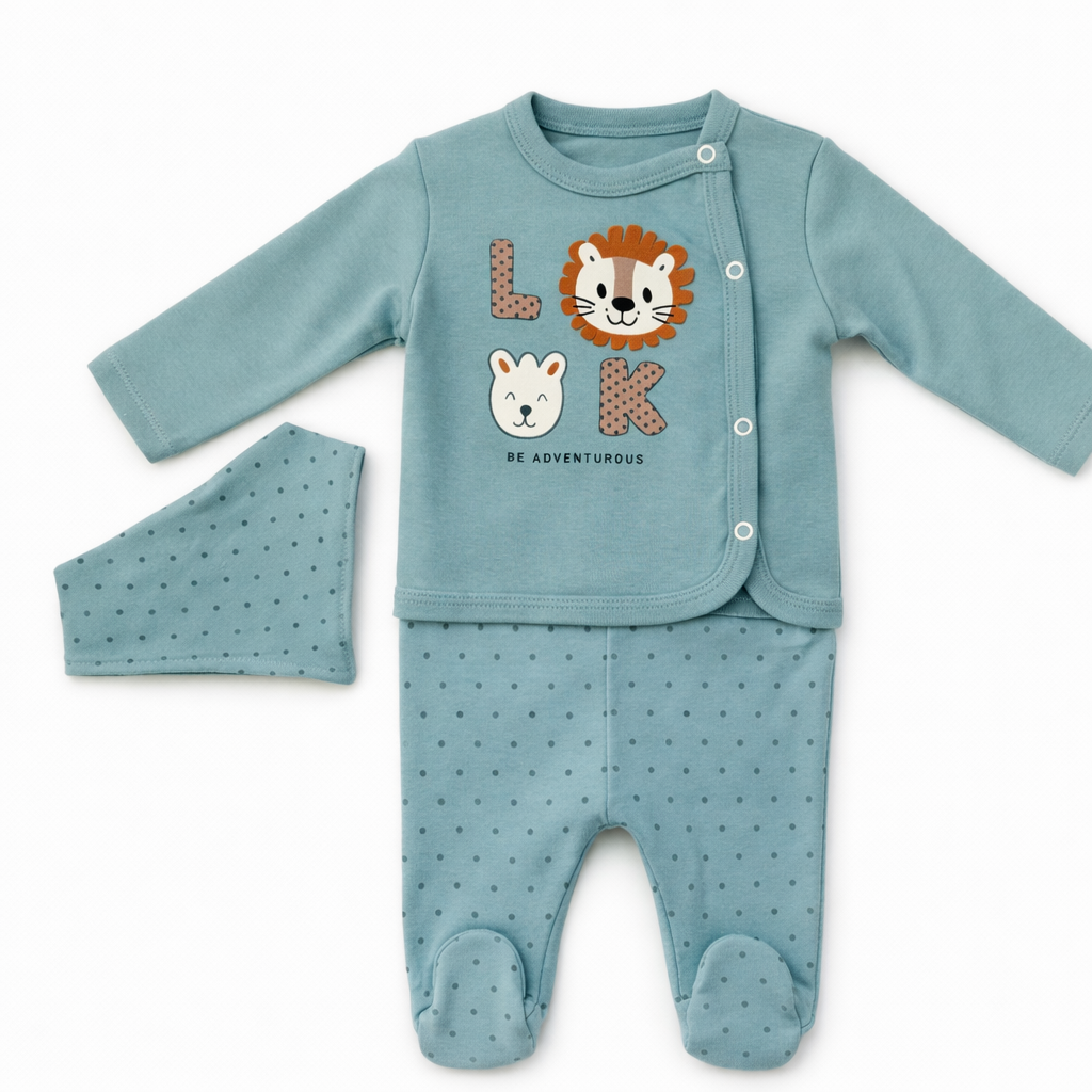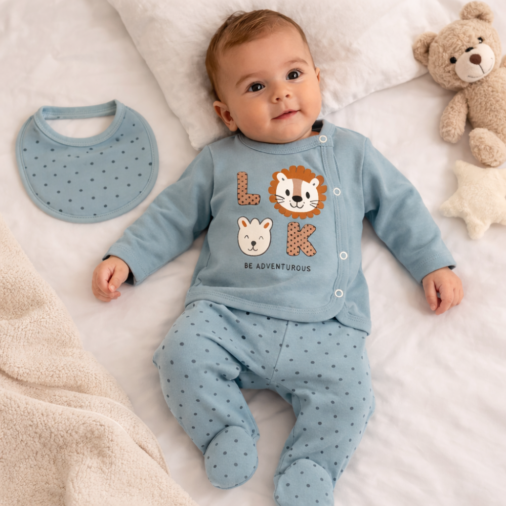 Set pentru nou nascuti realizat din 100% bumbac, conceput pentru confortul pielii sensibile a bebelusilor. Materialul este moale, respirabil si potrivit pentru utilizare zilnica.