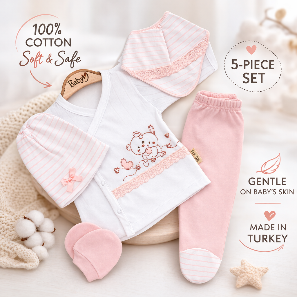 Acest set de haine pentru bebelusi este creat special pentru primele luni de viata, oferind confort si protectie pielii sensibile. Designul delicat cu model ursulet si nuante pastel roz transforma fiecare moment intr-unul plin de gingasie, fiind potrivit pentru nou-nascuti si pentru tinutele zilnice ale bebelusului.