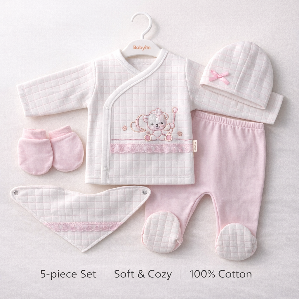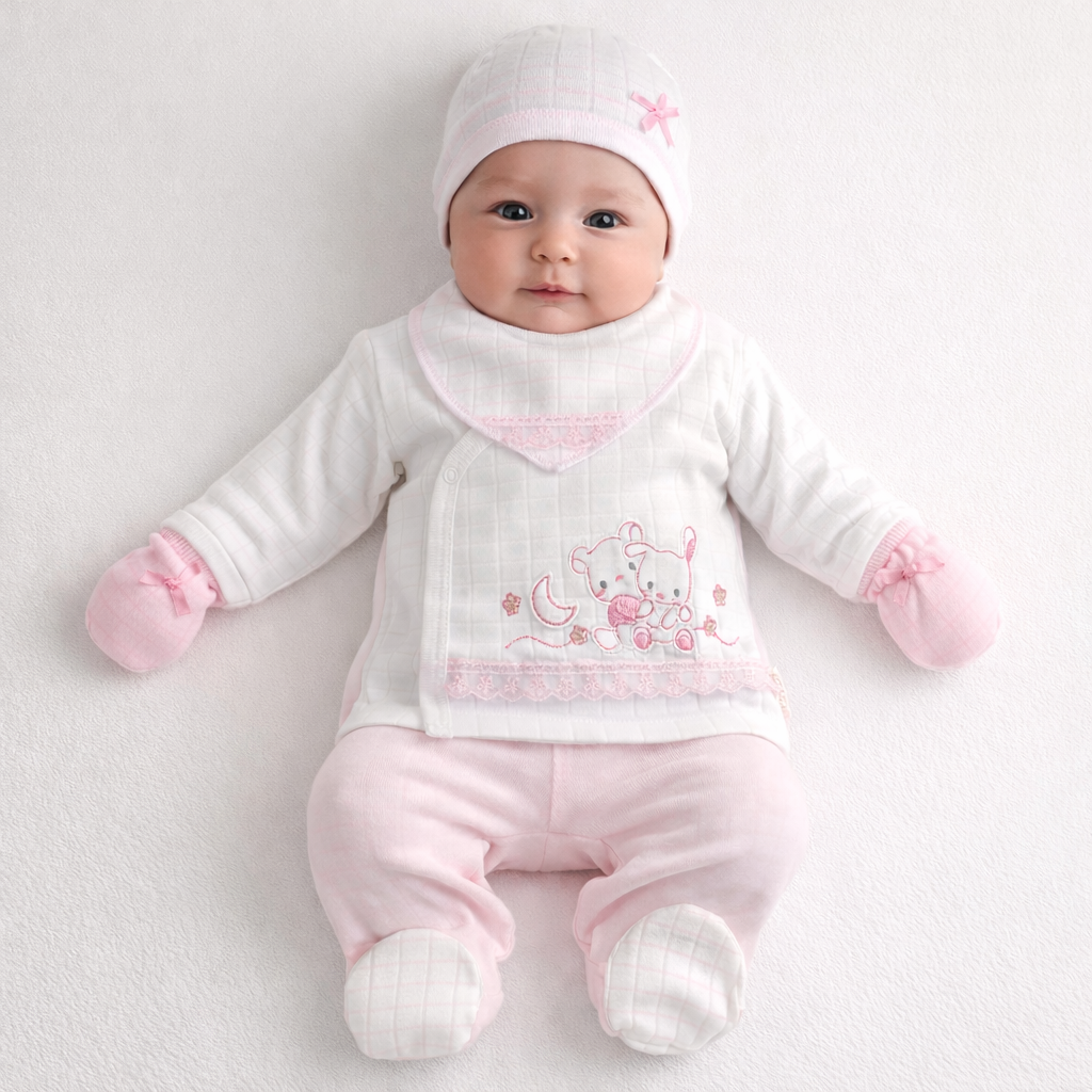 Acest set de haine pentru bebelusi este creat special pentru primele luni de viata, oferind confort si protectie pielii sensibile. Designul delicat cu model ursulet si nuante pastel roz transforma fiecare moment intr-unul plin de gingasie, fiind potrivit pentru nou-nascuti si pentru tinutele zilnice ale bebelusului.