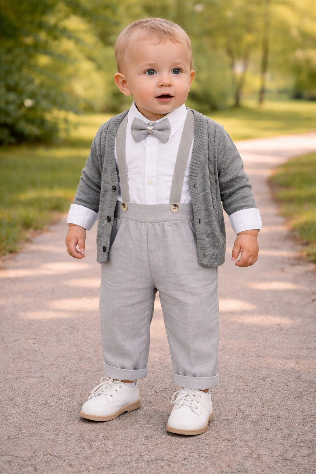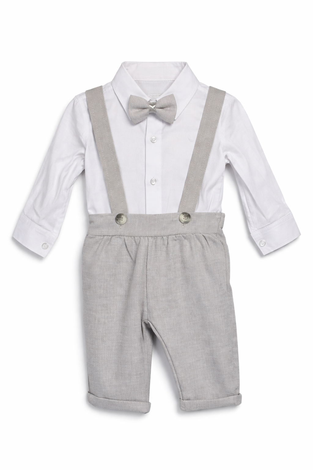Pantalonii gri au o croiala confortabila, cu talie elastica, oferind libertate de miscare si confort pe tot parcursul zilei. Papionul asortat completeaza outfitul si transforma tinuta intr-una perfecta pentru ocazii speciale precum botezuri, aniversari sau sedinte foto.