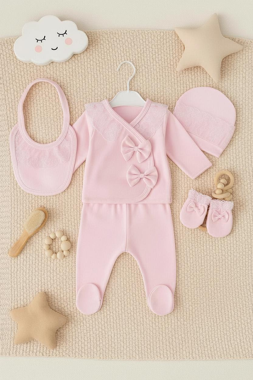 Acest set elegant pentru fetite 0-3 luni include 5 piese esentiale pentru primele zile si saptamani ale bebelusului. Toate piesele sunt realizate in nuanta roz pal, cu accente rafinate de dantela brodata, oferind un aspect delicat si foarte feminin.