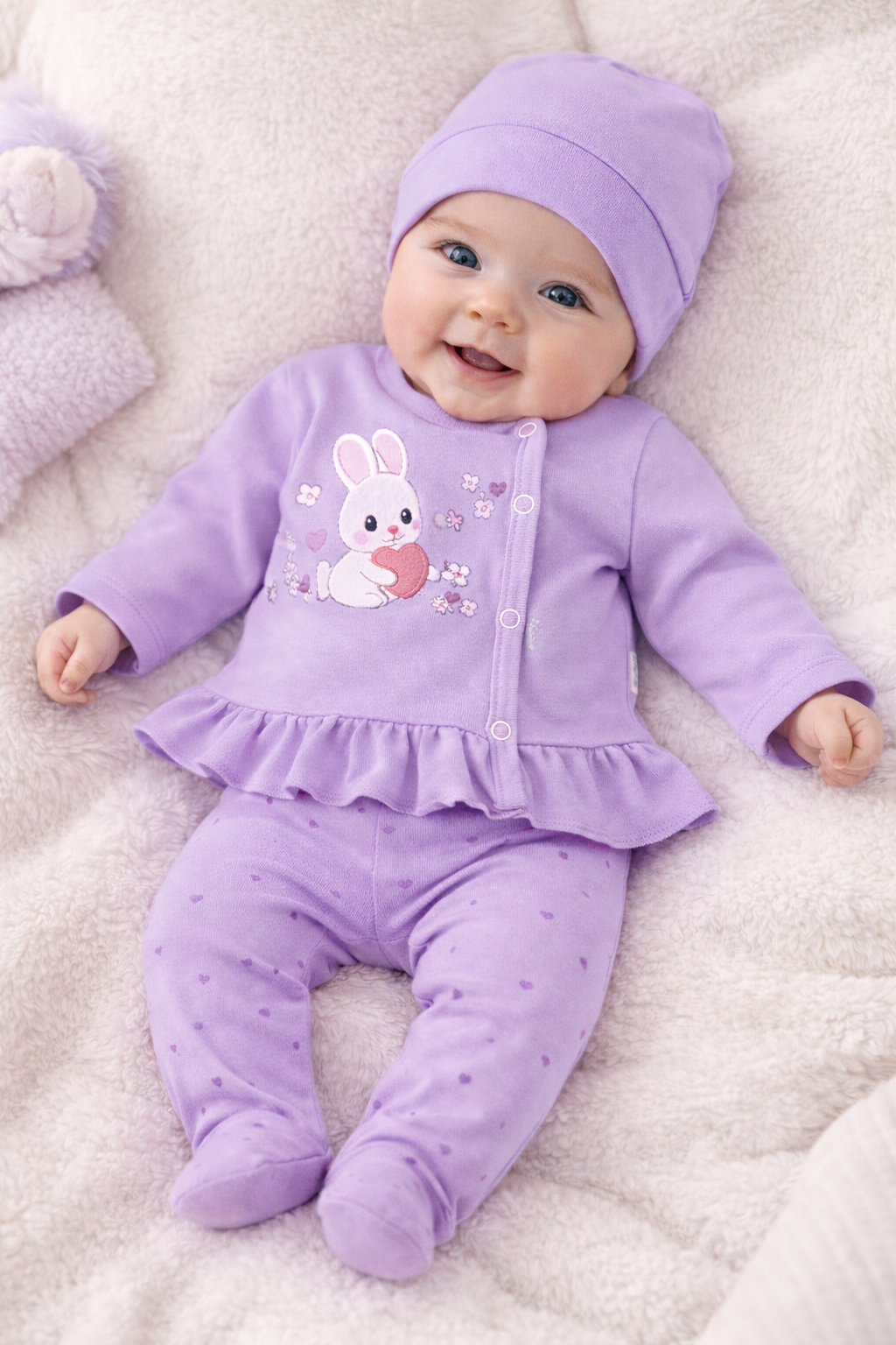 Set pentru nou-nascuti format din 3 piese, creat special pentru confortul si delicatetea primelor luni de viata ale bebelusului. Tinuta este realizata din material moale si placut la atingere, potrivit pentru pielea sensibila a nou-nascutilor si pentru purtare zilnica.
