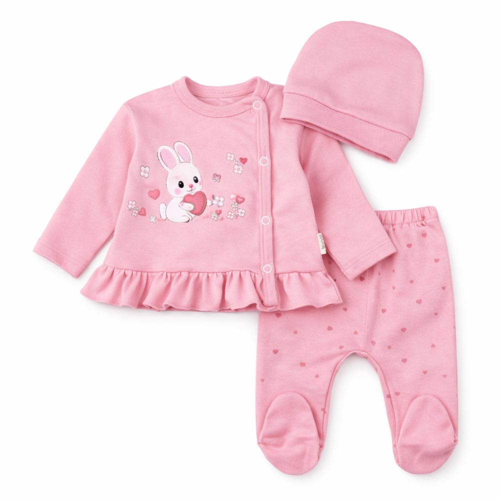 Setul contine 3 piese: bluza cu imprimeu iepuras, pantaloni cu botosi integrati si caciula.
