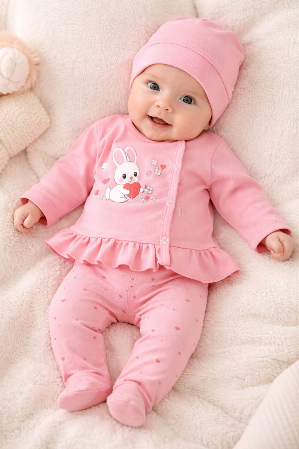 Set pentru nou-nascuti format din 3 piese, creat special pentru confortul si delicatetea primelor luni de viata ale bebelusului. Tinuta este realizata din material moale si placut la atingere, potrivit pentru pielea sensibila a nou-nascutilor si pentru purtare zilnica.