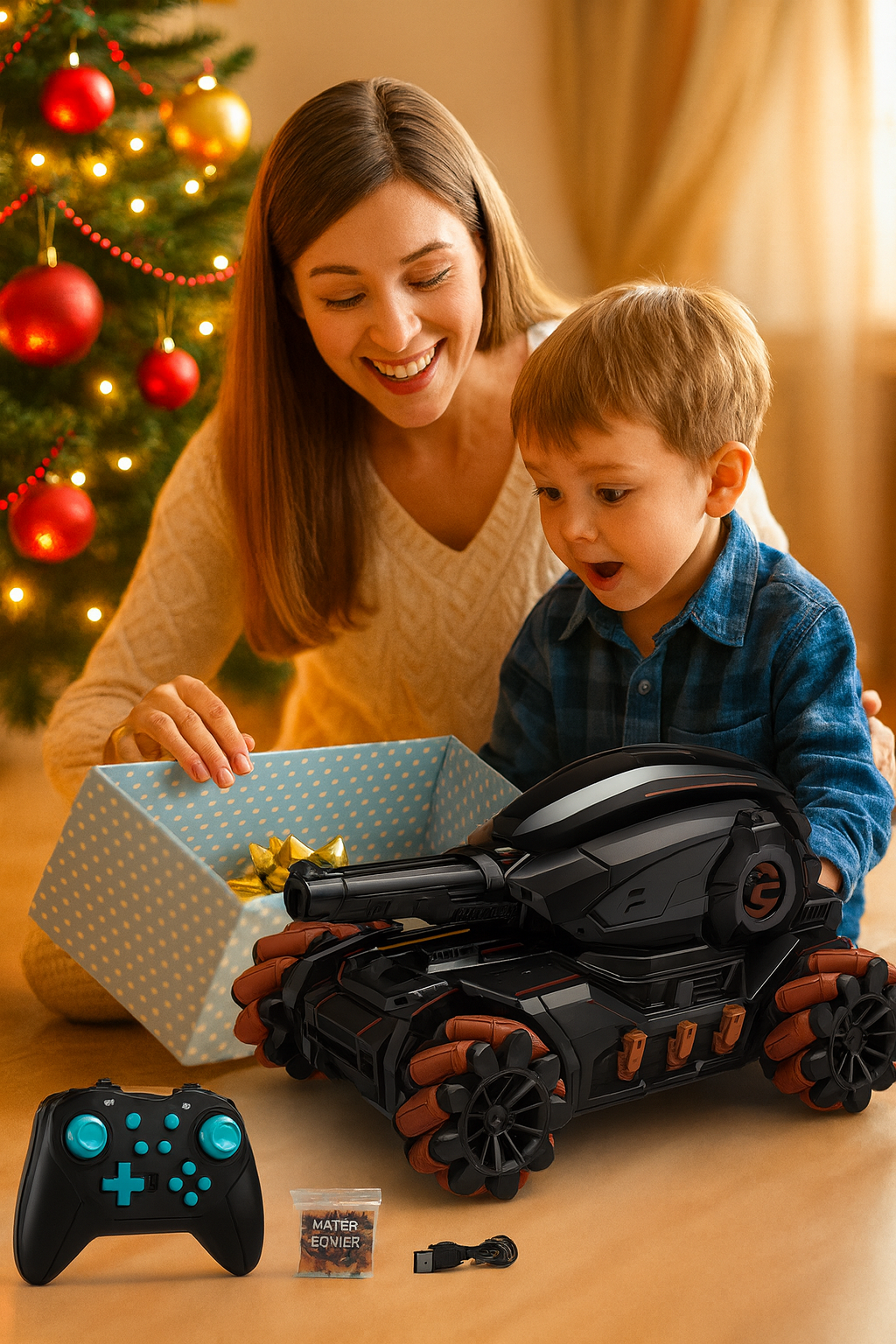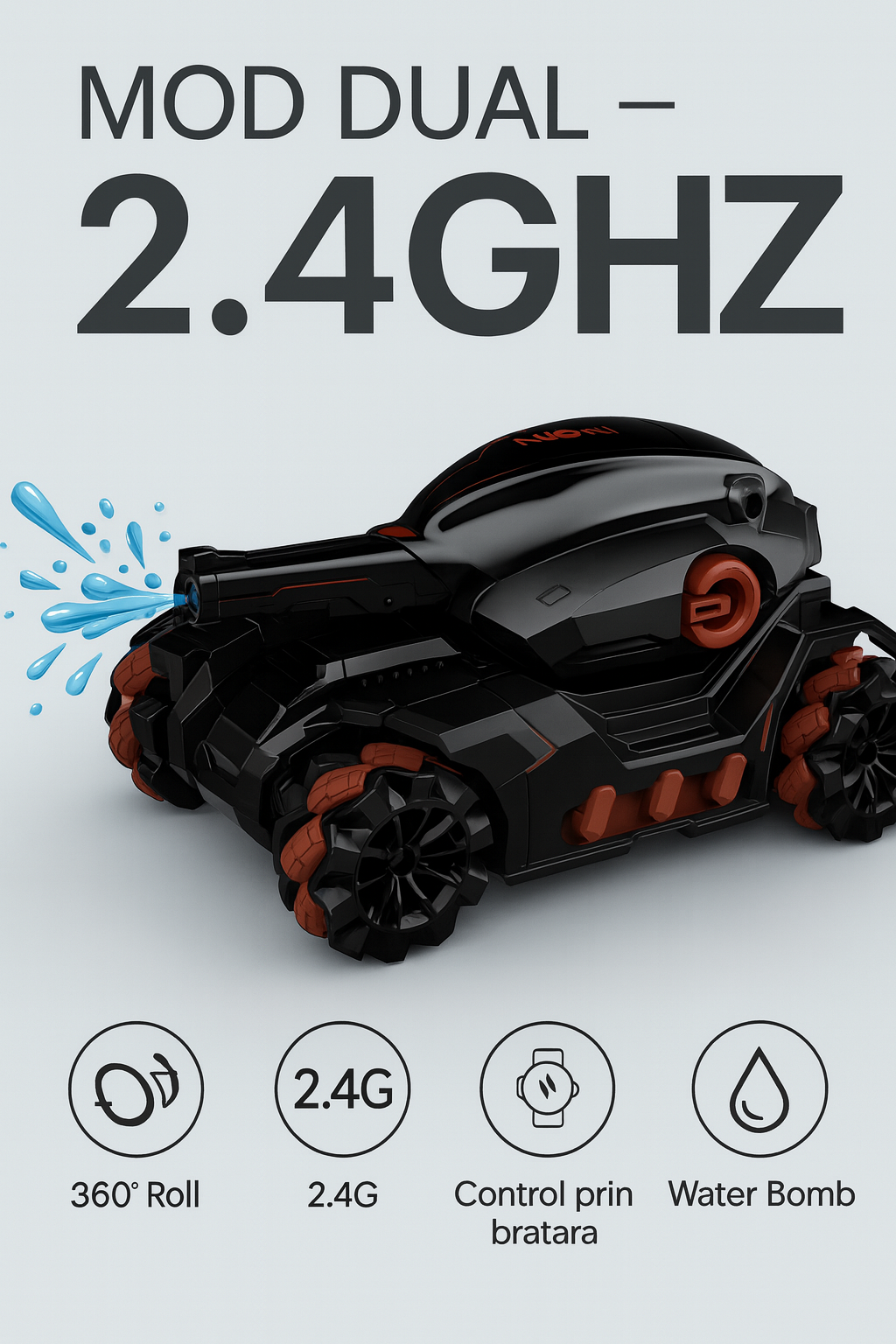 Tancul RC „Tank Fight” impresionează prin designul negru-cupru, roțile mecanum pentru manevre laterale și modul spectaculos de tragere cu „water bomb” – bile de apă gelificate care fac jocul dinamic, dar sigur.