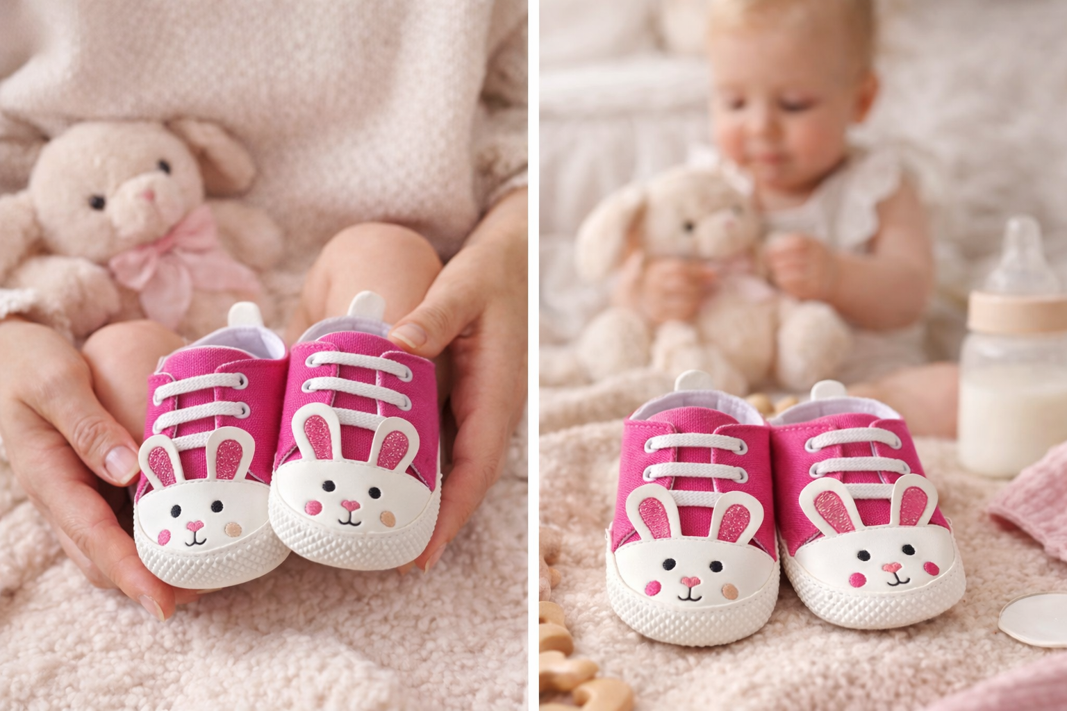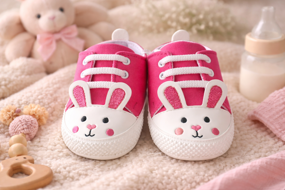 Tenisi pentru bebelusi cu design adorabil tip iepuras, realizati din materiale moi si confortabile, ideali pentru primele luni de viata. Partea frontala este decorata cu fata de iepuras, iar inchiderea cu sireturi elastice asigura o fixare usoara si rapida.