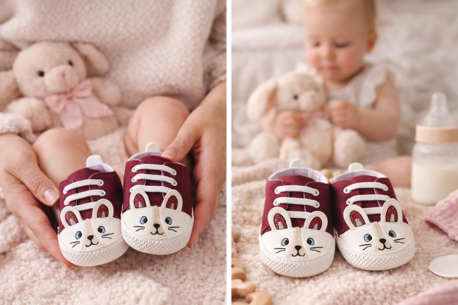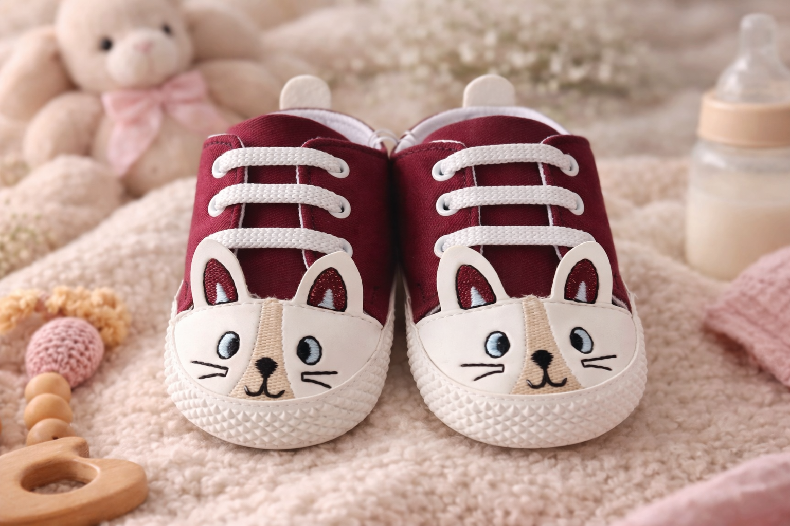 Tenisi pentru bebelusi in culoare visiniu, cu design simpatic tip pisicuta, marca LEONCINO SPORT, realizati din materiale moi si confortabile, ideali pentru primele luni de viata. Partea frontala este decorata cu fata de pisicuta, oferind un aspect jucaus si atractiv.