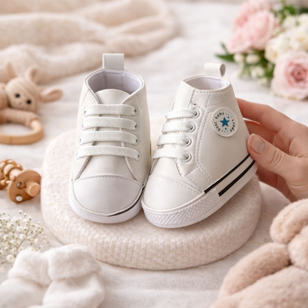 Tenisi pentru bebelusi de culoare alba, cu design modern tip sneakers, prevazuti cu sireturi albe si varf protejat. Modelul este realizat din materiale usoare si confortabile, potrivite pentru pielea sensibila a copilului.
