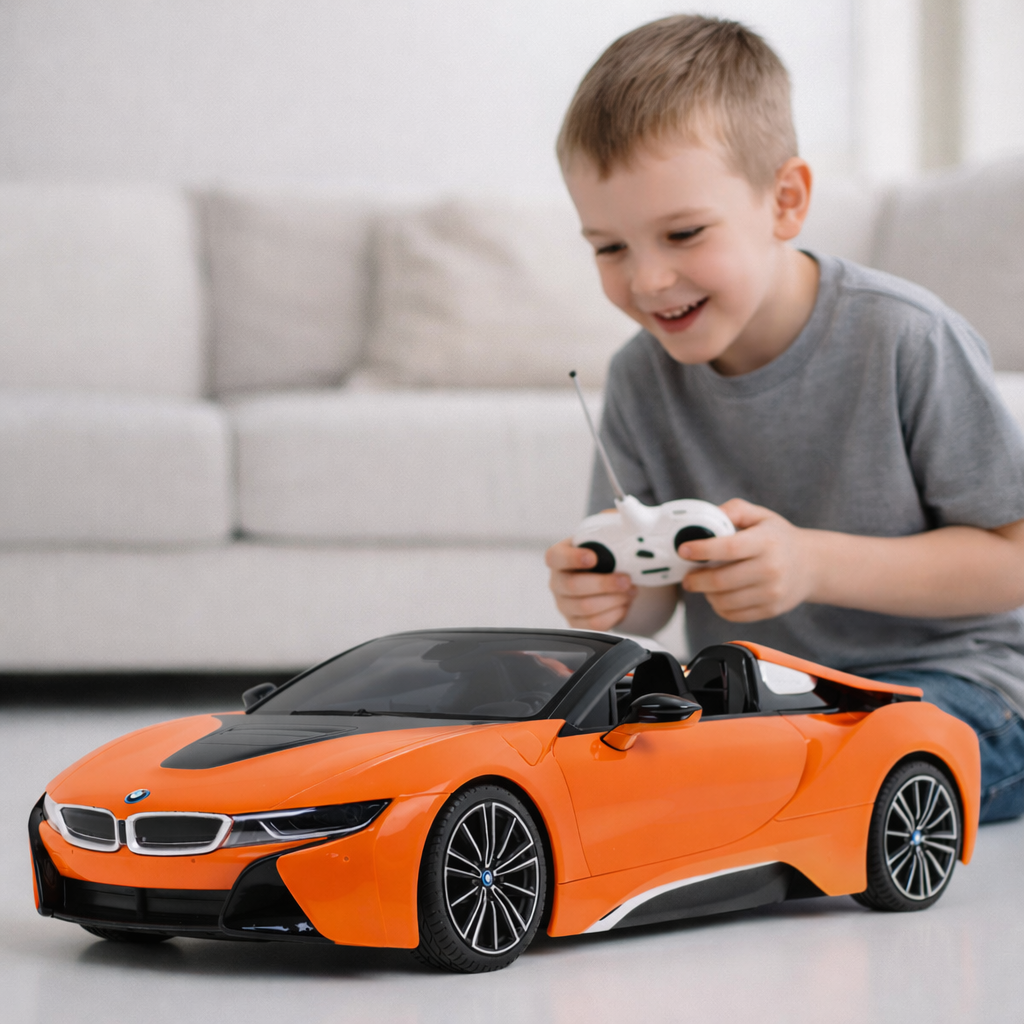 Masina R/C BMW i8 Roadster 1:12 RASTAR cu lumini LED, control precis 2.4 GHz si design realist. Ideala pentru copii peste 6 ani.
